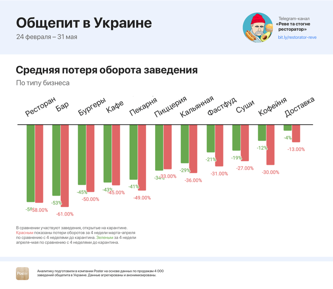 За чотири тижні квітня-травня просадка по обороту у невеликих ресторанів середнього цінового сегмента склала в середньому 58%, у барів — 53% в порівнянні з чотирма тижнями до карантину. Бургерні та кафе втратили 45% і 43% відповідно. Кав’ярні за цей період в середньому втратили 12% від докарантинних продажів. Найменше просіли заклади, які і до карантину працювали тільки на доставку, — всього на 4%.