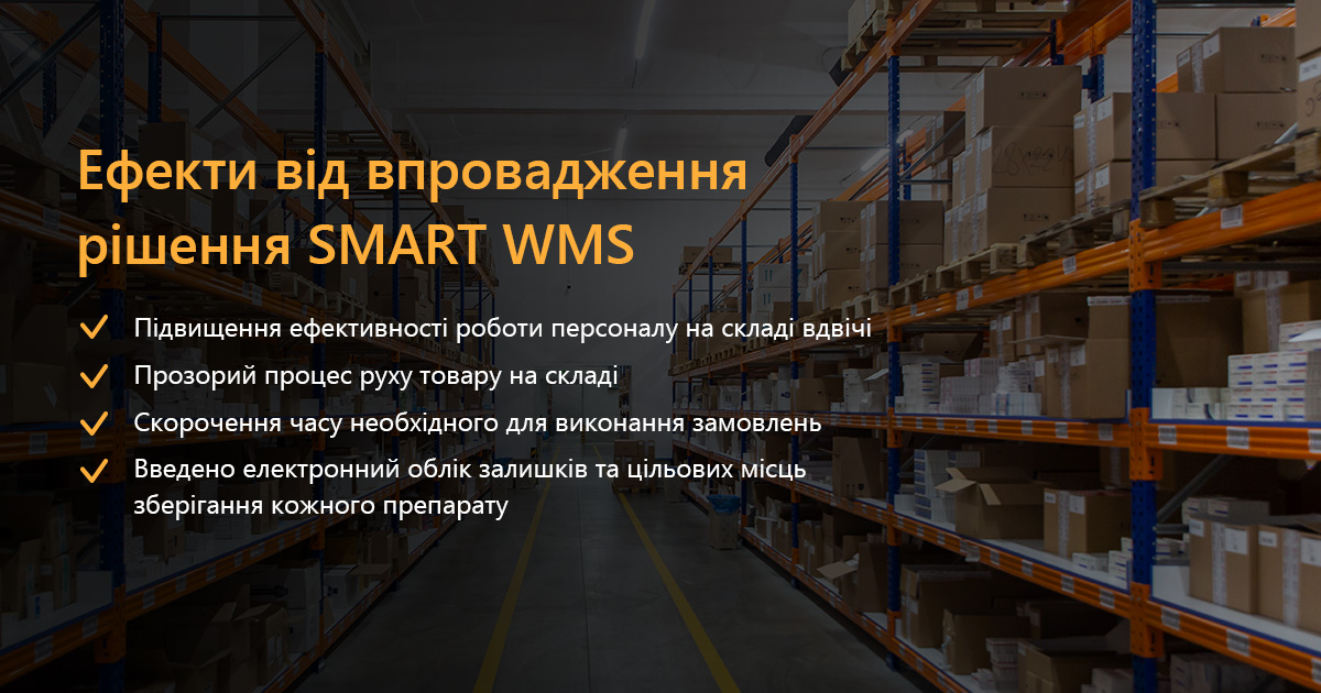Впровадження SMART WMS дозволило успішно оптимізувати всі складські операції та підвищити ефективність управління запасами компанії. Завдяки автоматичній пріоритезації складських операцій та інструментам прозорого моніторингу всіх важливих процесів зменшилась кількість ручних помилок та вдвічі зросла продуктивність роботи команд. Оптимізація процесів складського управління дозволила компанії забезпечити своєчасне постачання продукції до 300 аптек та філій партнерів, тримаючи планку клієнтського обслуговування на найвищому рівні.