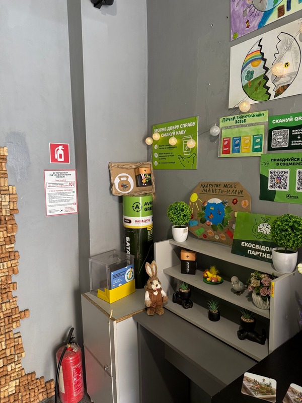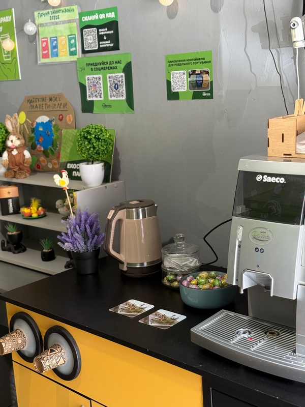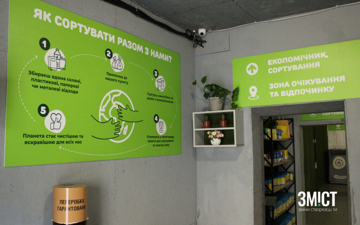 Тут можна здати на переробку 32 види сировини, зокрема пластик, папір, скло, алюміній, метал та батарейки. Також можна випити запашну каву та отримати мотивацію за сортування у вигляді екочашки, пакетів для сортування, екошопера тощо.