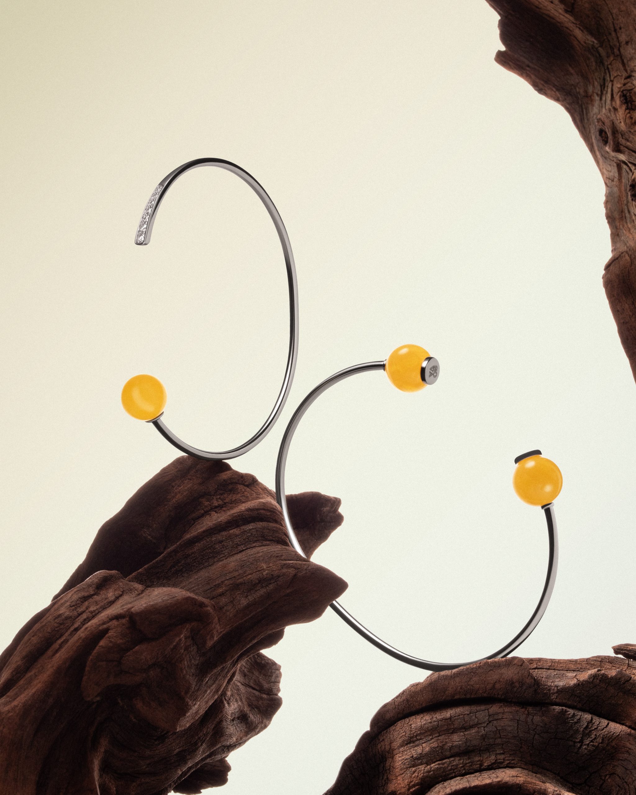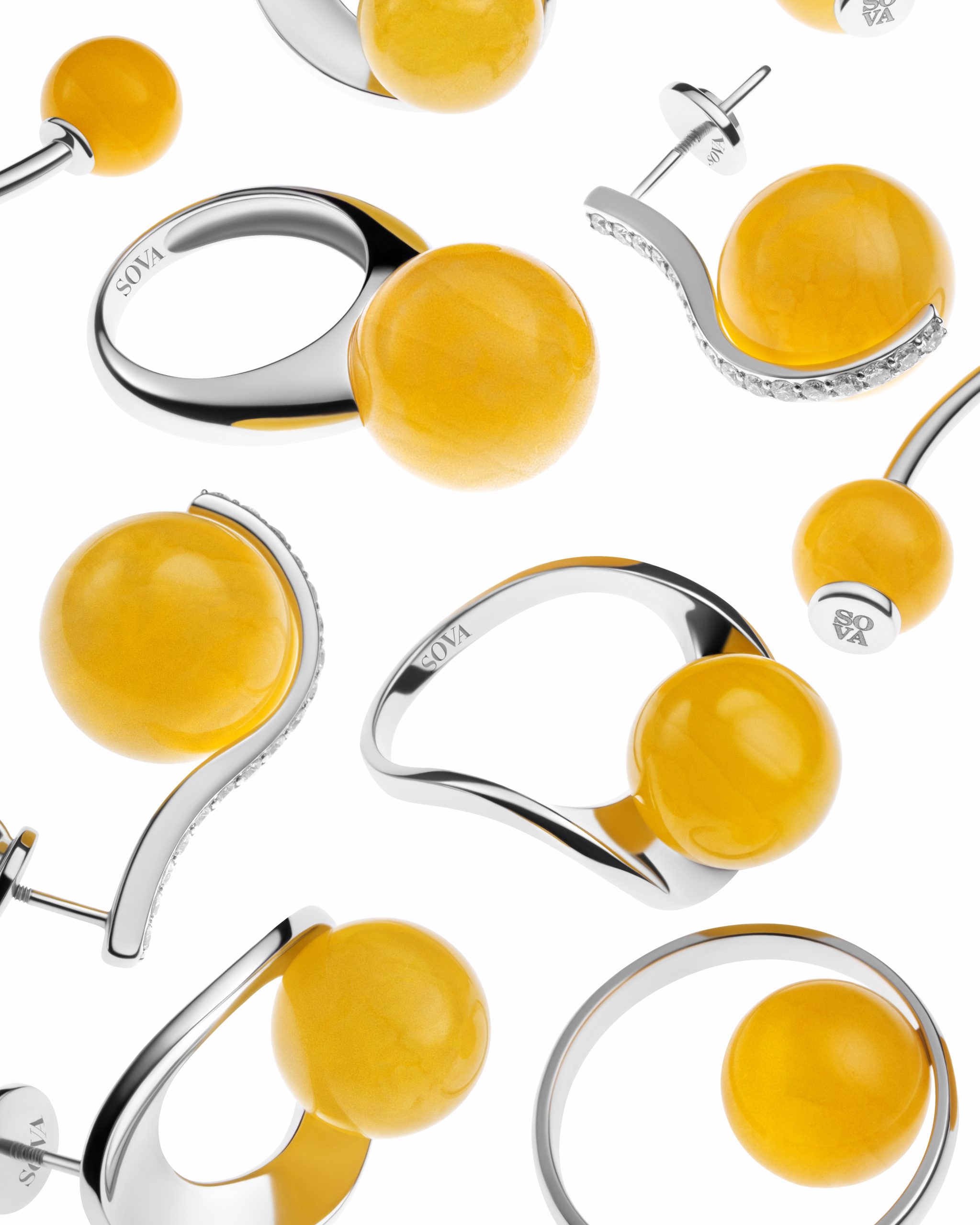 До колекції увійшли кольє, браслети, каблучки, сережки та кафа. Окремі прикраси оздоблені діамантами, що додають переливи світла до яскравих вставок. Арткоманда SOVA розкрила бурштин по-новому — сучасно та виразно. Його теплий природний відтінок контрастує з кольором білого металу. Вигини золота огортають бурштинові сфери, ніби створюють баланс між динамікою та статикою. Серед акцентних прикрас — мінімалістичні жорсткі кольє та каблучка на два пальці, лінії яких повторюють природні форми.