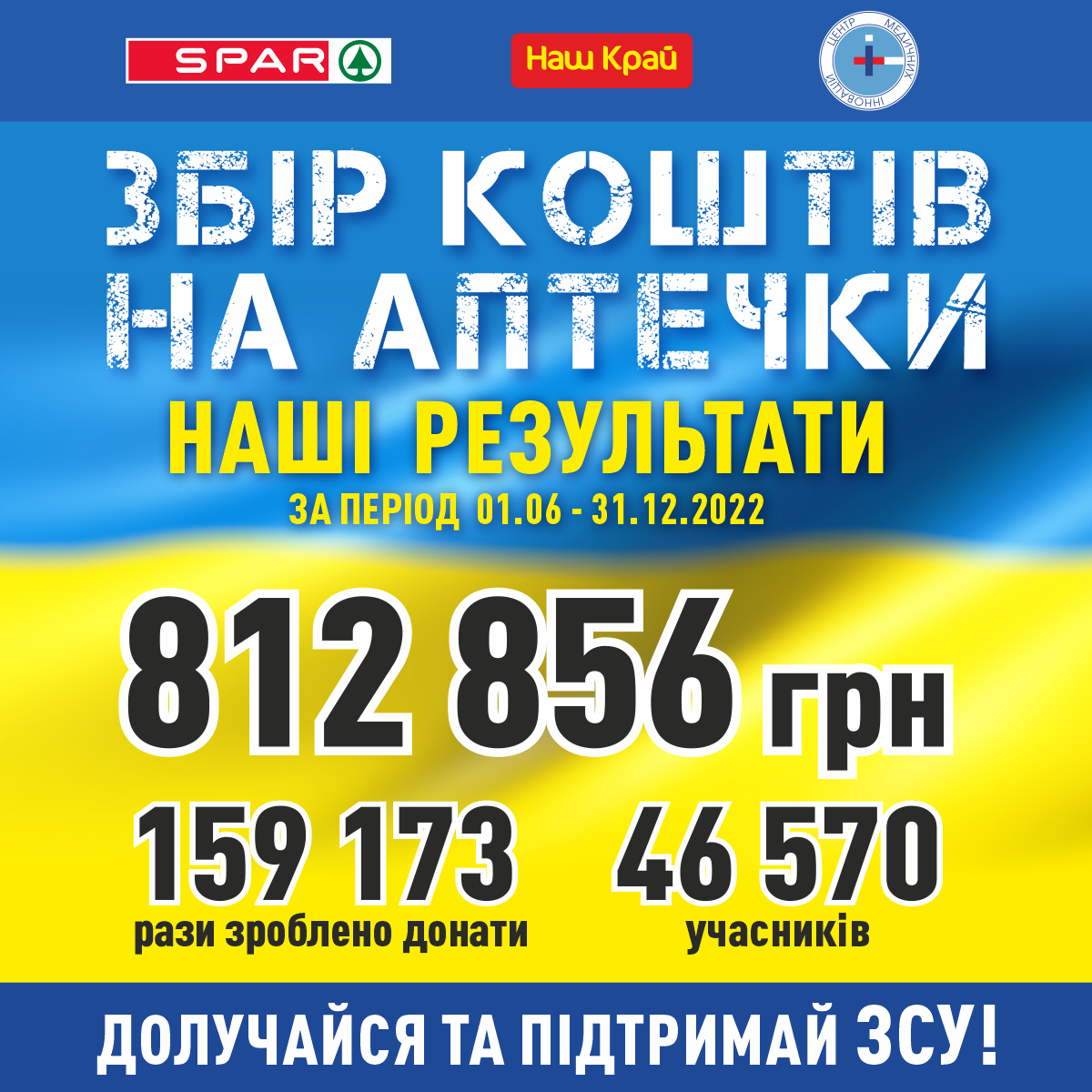 Зараз кожен українець прагне бути ефективним та допомагати армії, аби наблизити перемогу. Хтось перераховує частину заробітної плати, хтось виділяє час та волонтерить, – хтось підтримує збори фондів. Тож у червні, в розпал війни у мережах Наш Край і SPAR стартувала благодійна ініціатива «Гривня для ЗСУ», аби допомогти нашим військовим. Адже 90% поранених помирають ще до того, як потрапляють у лікарню, тому надання домедичної допомоги на полі бою вкрай важливе. При наявності особистої аптечки, врятувати бійця може побратим, або ж сам поранений. Тож усі зібрані кошти перераховуються ГО «Технопарк «Центр медичних інновацій», яка займається формуванням аптечок й тактичних наплічників для військових.