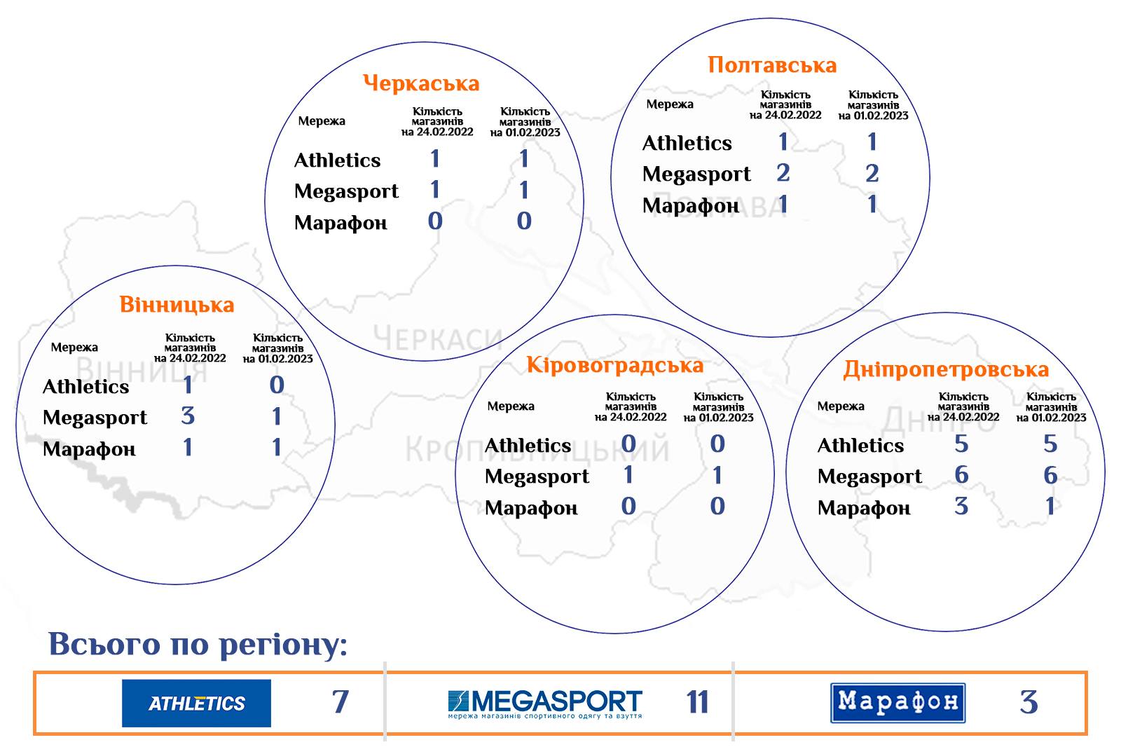 У центральному регіоні також поступово кількість магазинів повертається до довоєнного рівня. Зокрема, у Дніпропетровській області зачинились два магазини Марафон, а у Вінницькій області – один магазин Аthletics та два Megasport. Решта магазинів цих мереж вже працюють на регулярній основі.