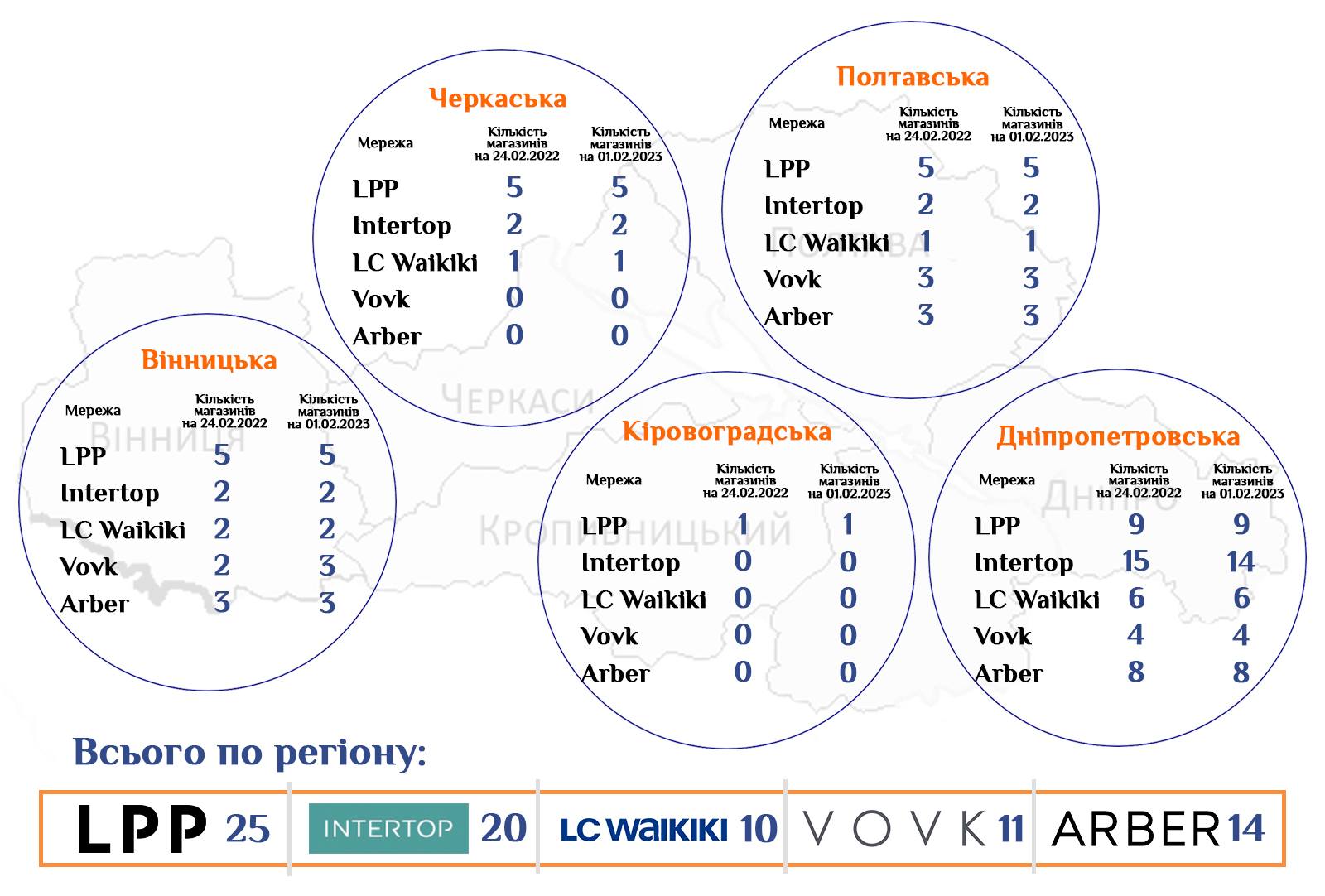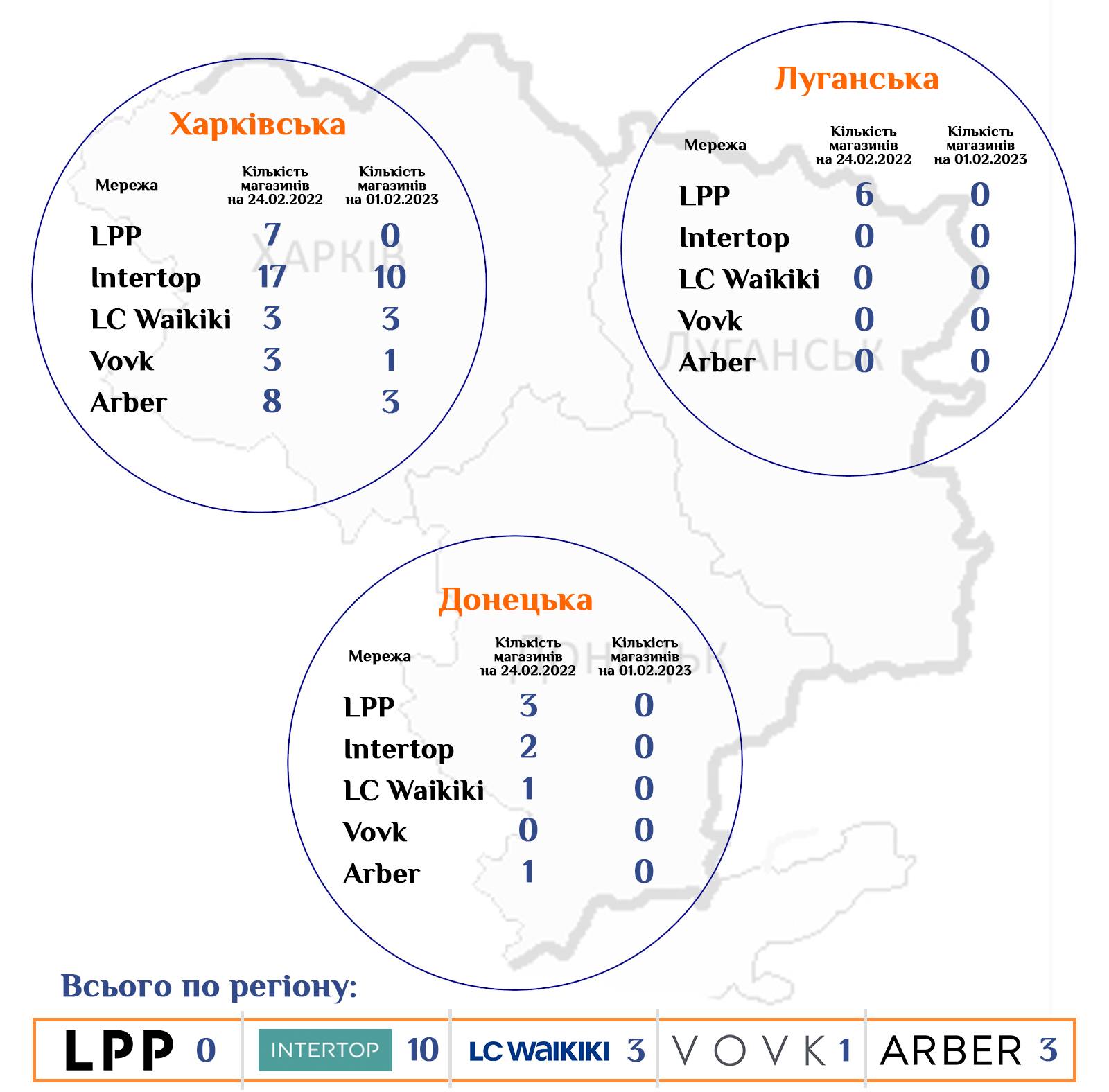 Наразі східні області України – найскладніший та найнебезпечніший регіон для роботи. Постійні обстріли, близькість до лінії фронту та масштабне переселення місцевих жителів за кордон та у безпечніші регіони України вплинули на діяльність усього рітейлу. І fashion не є виключенням. Так, польський холдинг LPP наразі повністю призупинив свою діяльність в усіх східних областях. Мережа Intertop втратила два магазини у Донецькій області, але вже поновила роботу 10 з 17 магазинів у Харківській області. У мереж LC Waikiki та Arber зараз працює по три магазини у Харківській області. Мережа LC Waikiki, крім того, у процесі підписання договору на відкриття pop-up магазину у Харкові. Також у Харкові зараз працює одна студія мережі Vovk, решта дві – поки що на паузі.