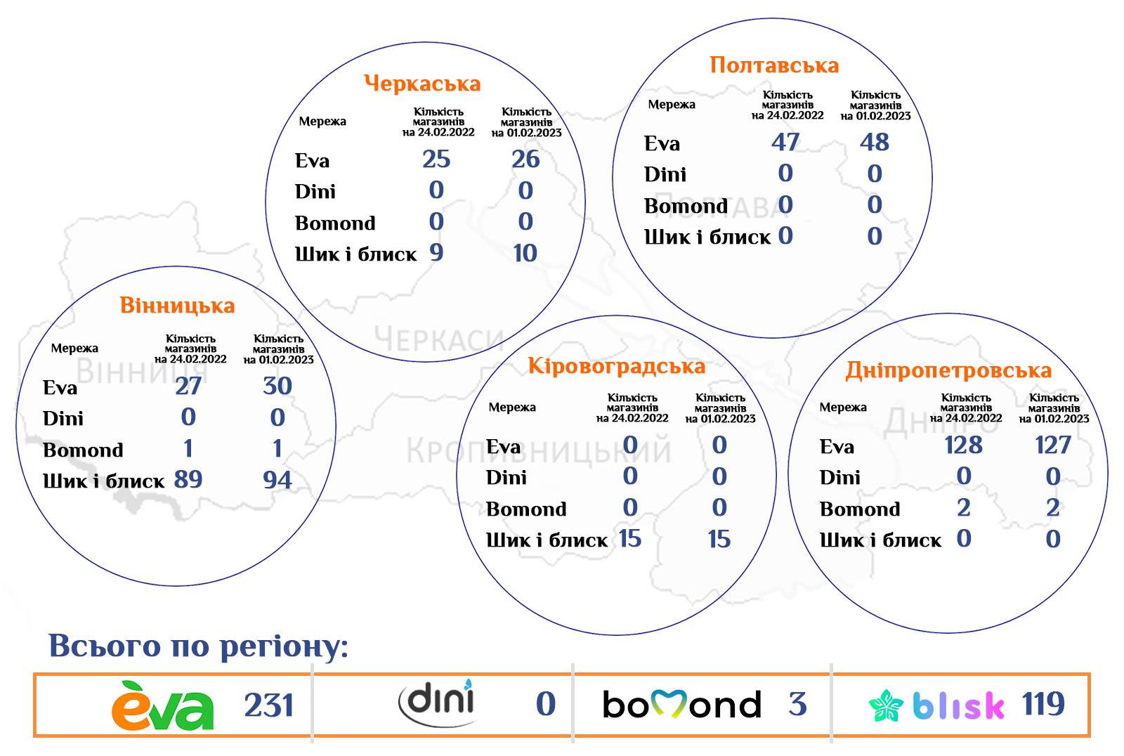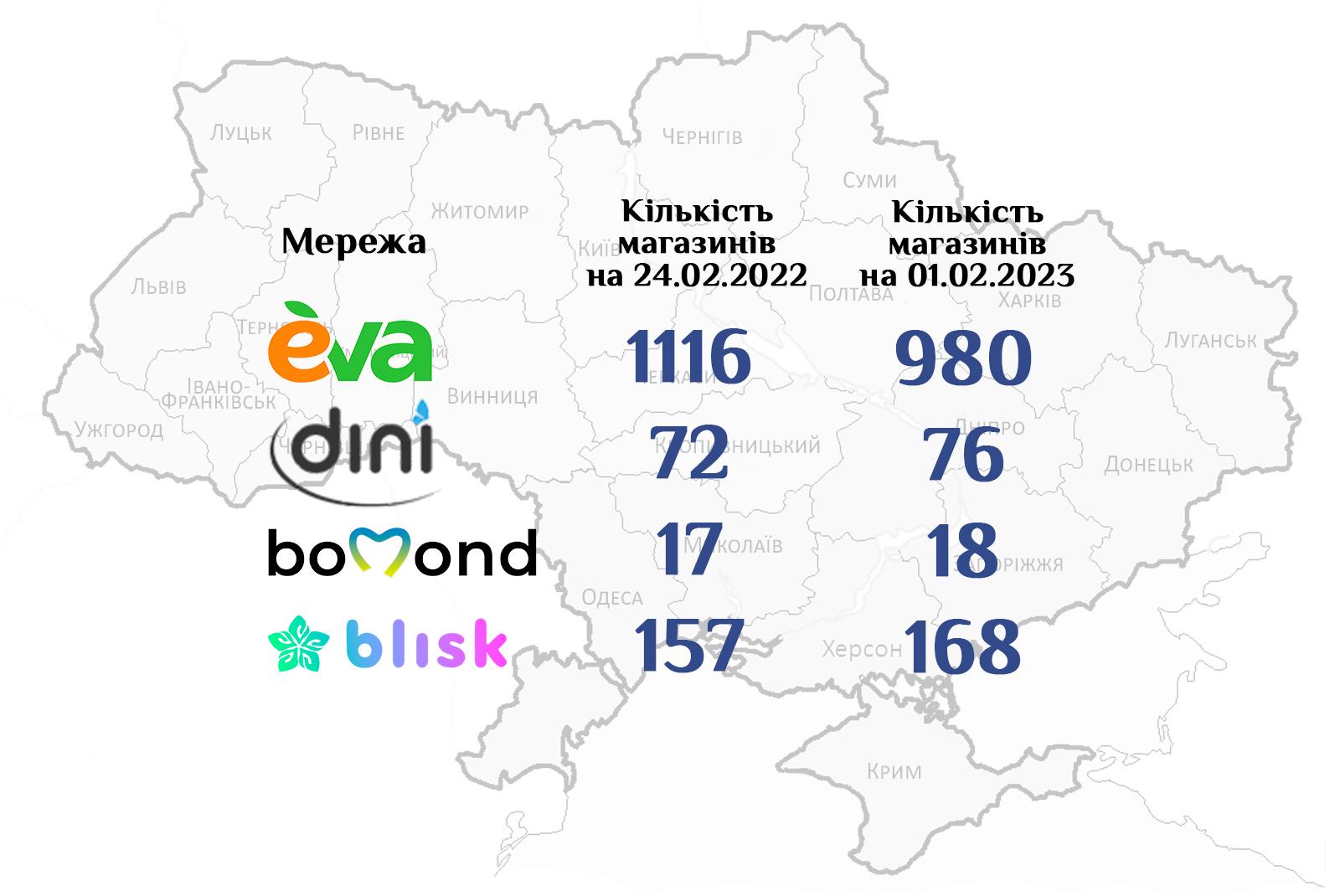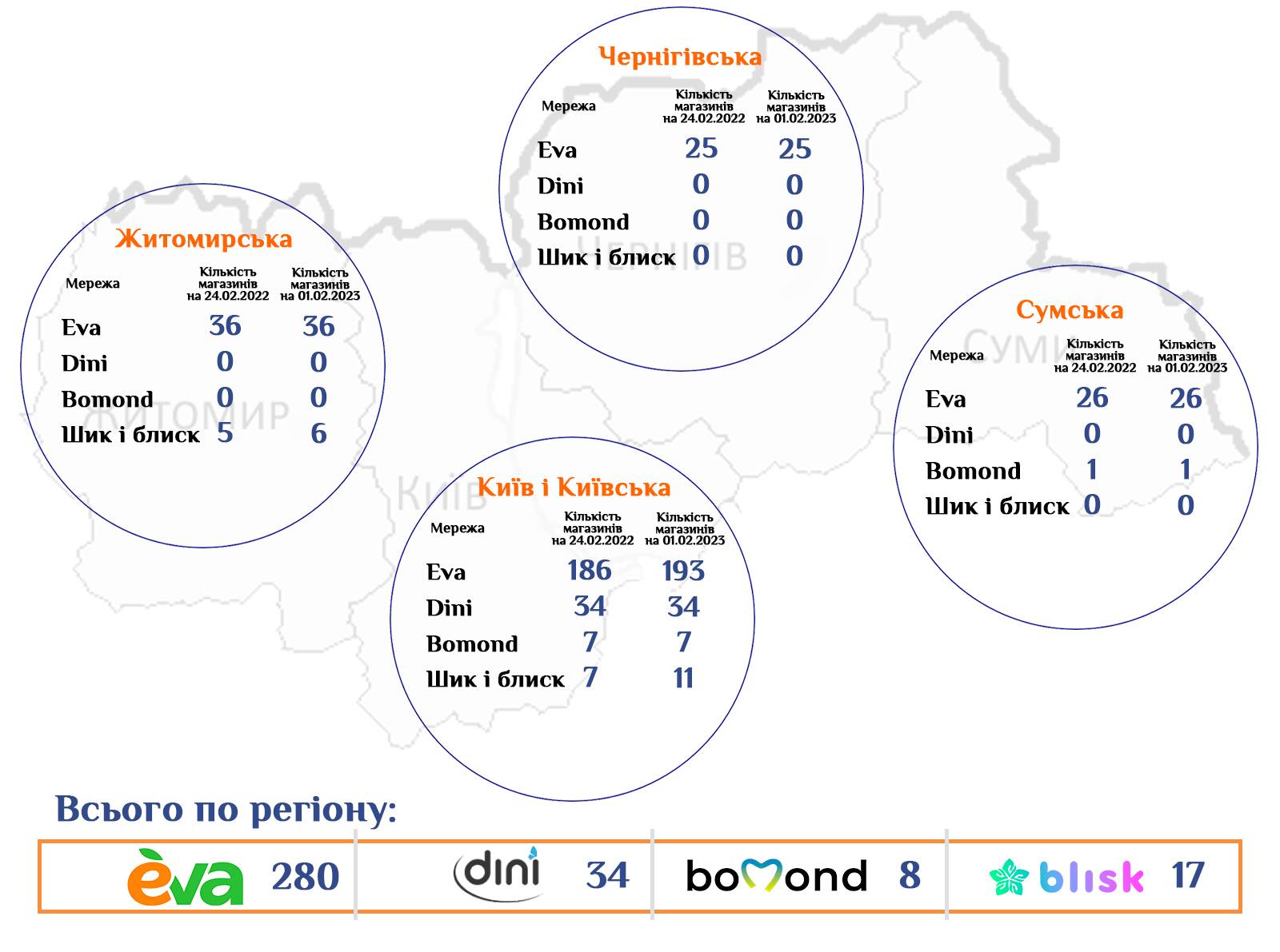 У північних областях повністю відновили свою діяльність мережі EVA, Dini та Воmond. Крім того, мережа EVA відкрила сім нових магазинів у Київській області, а мережа Шик і Блиск – чотири нових магазинів у Київській області та один магазин у Житомирській області.