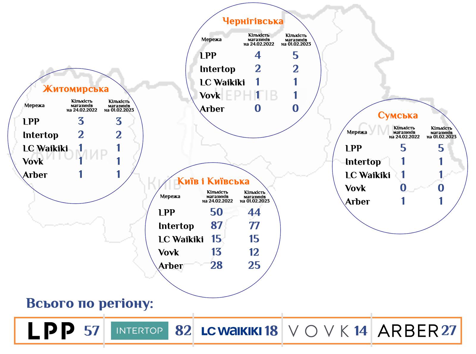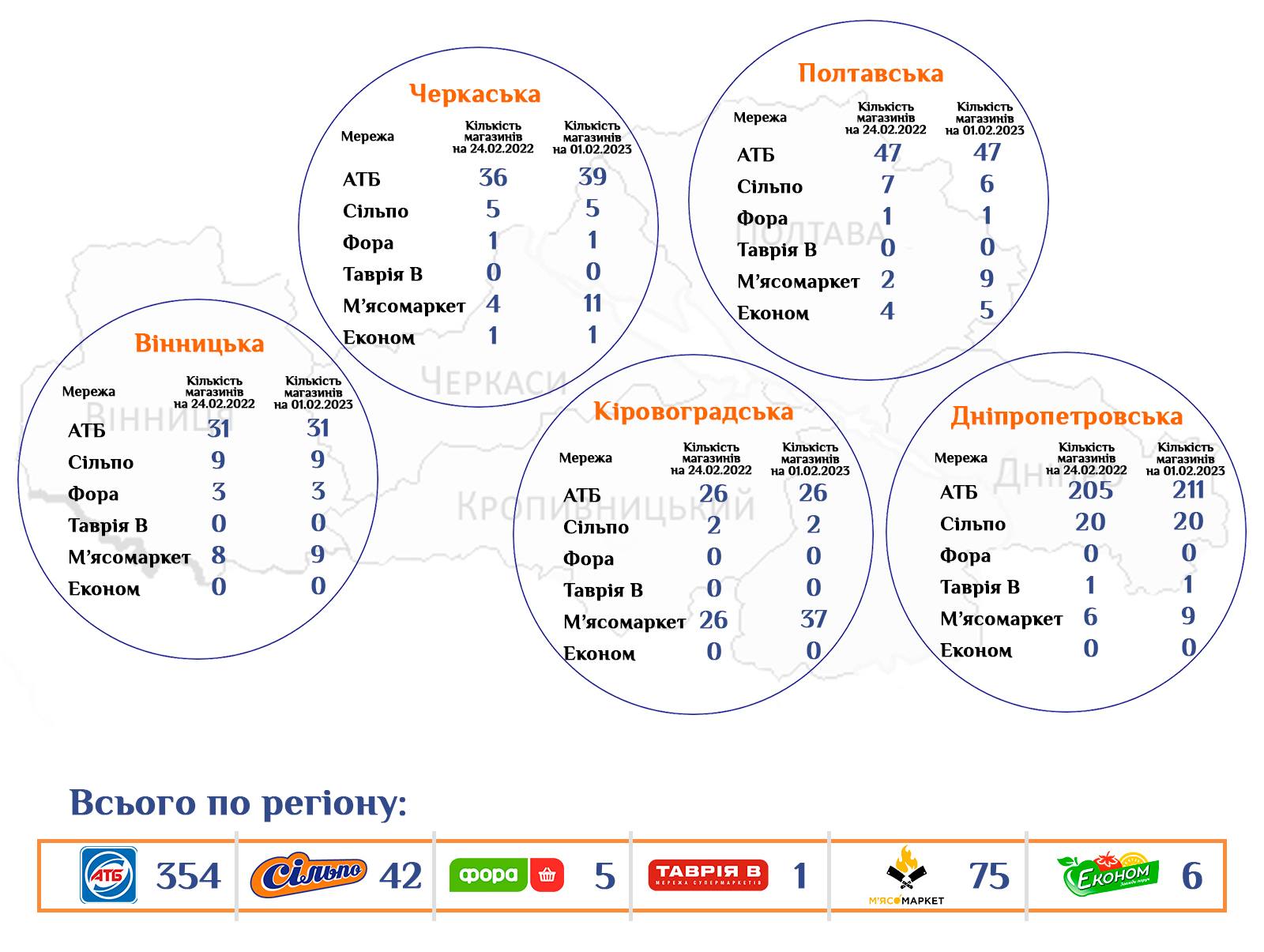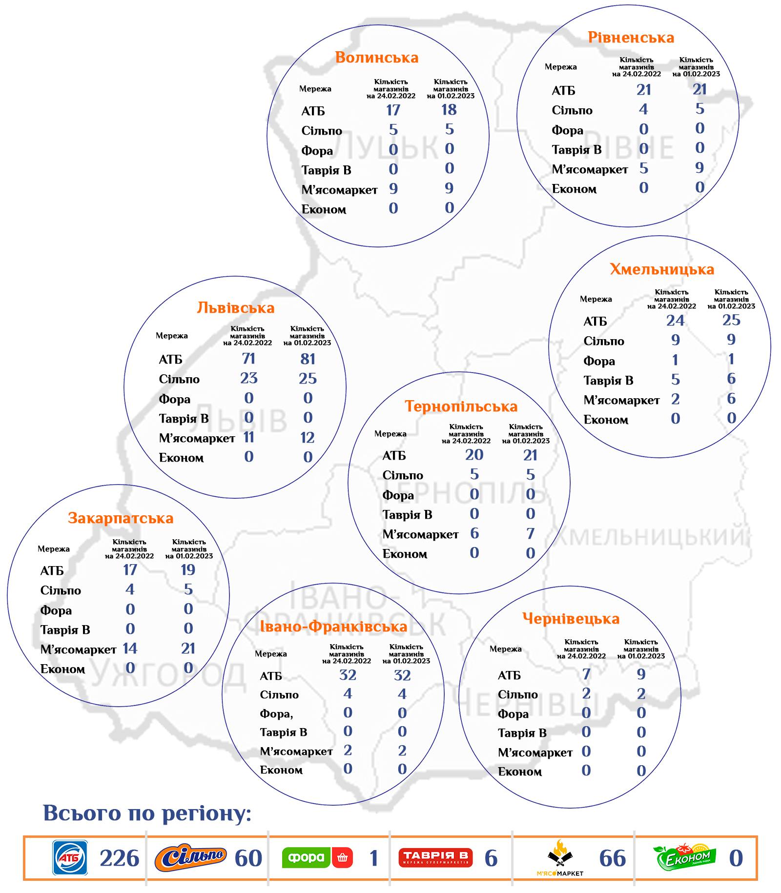 Цікаво, що в Чернігівській та Сумській областях, які також перебували в зоні активних бойових дій, суттєвих змін у мереж не сталося, лише АТБ стало менше на чотири магазини. В Сумській та Житомирській області активно збільшував кількість локацій М’ясомаркет. Так само Фора збільшила мережу на два магазини у Житомирській області.