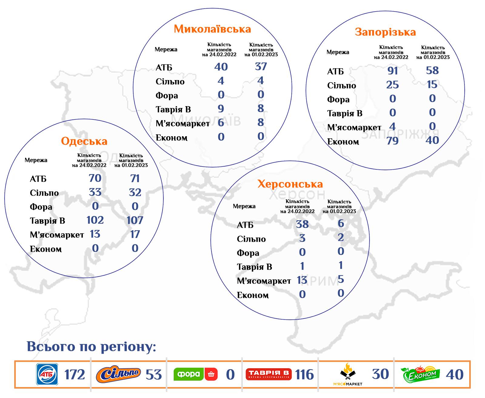 Серед південних областей найбільше постраждав рітейл у Херсонській та Запорізькій областях. Так, у цих двох регіонах АТБ втратив 65 магазинів, а Сільпо – 11 супермаркетів, М’ясомаркет -12.