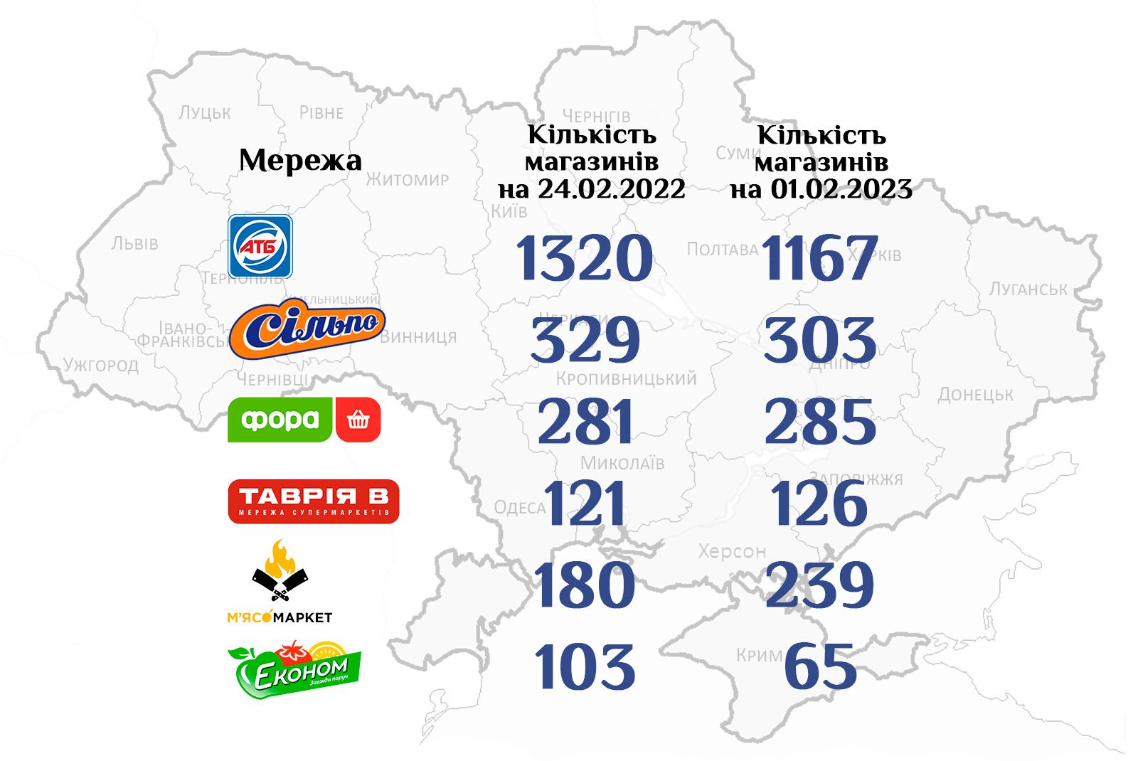 Продуктові мережі – один із найбільш затребуваних видів роздрібної торгівлі, оскільки вони забезпечують населення товарами першої необхідності. Великі національні мережі, такі як АТБ та Сільпо були присутні у всіх областях України і продовжують працювати там, де це можливо. Представники спеціалізованого рітейлу навіть активно нарощують присутність у більшості областей, як-от мережа магазинів М’ясомаркет, яку розвиває холдинг МХП за схемою франчайзінгу. Наразі рітейлер працює у 21 регіоні й за рік збільшив кількість торгових точок із 180 до 239-ти.
