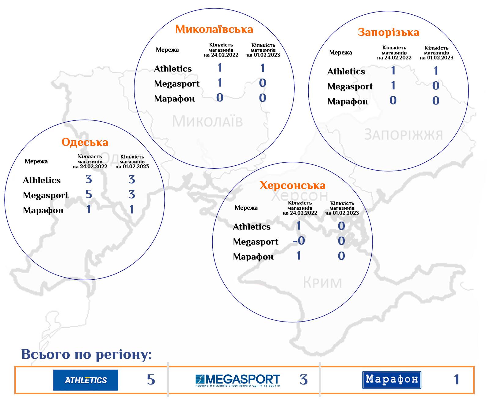 У південному регіоні найкраща ситуація з працюючими спортивними магазинами у Одеській області. Тут зараз працює три з трьох магазинів магазинів Athletics, три магазини з п’яти магазинів Megasport, які мережа мала тут до 24 лютого 2022-го. А також продовжує працювати магазин Марафон.