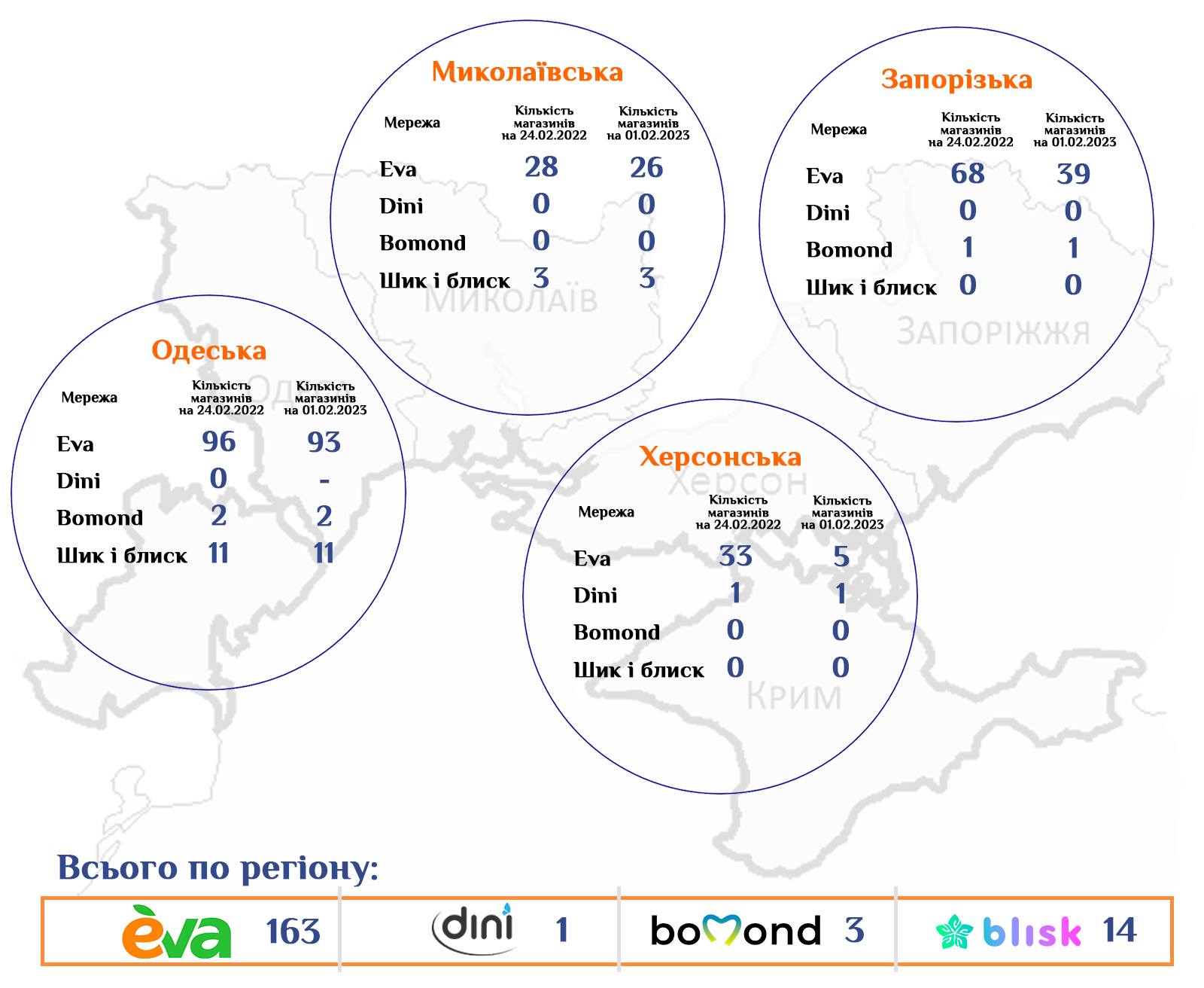 У південному регіоні ситуація значно краща, ніж на сході. Тут наразі працюють усі опитаних рітейлери. Зокрема, EVA представлена 163 магазинами в регіоні, Dini – одним, Bomond – 3, а також Шик і Блиск – 14 магазинами.