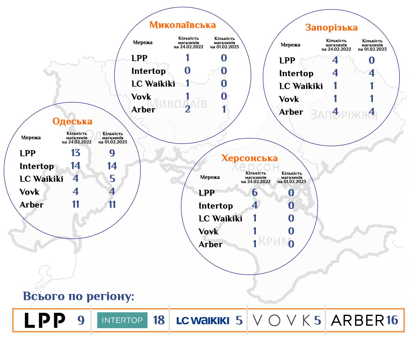У південному регіоні магазини холдингу LPP працюють лише у Одеській області – 9 магазинів з 13. Генеральний директор LPP Ukraine Ярема Івахів зазначив, що зараз компанія фокусується на існуючих магазинів,. “В нас є розуміння та бачення: як працювати в теперішніх умовах”, – говорить пан Ярема.