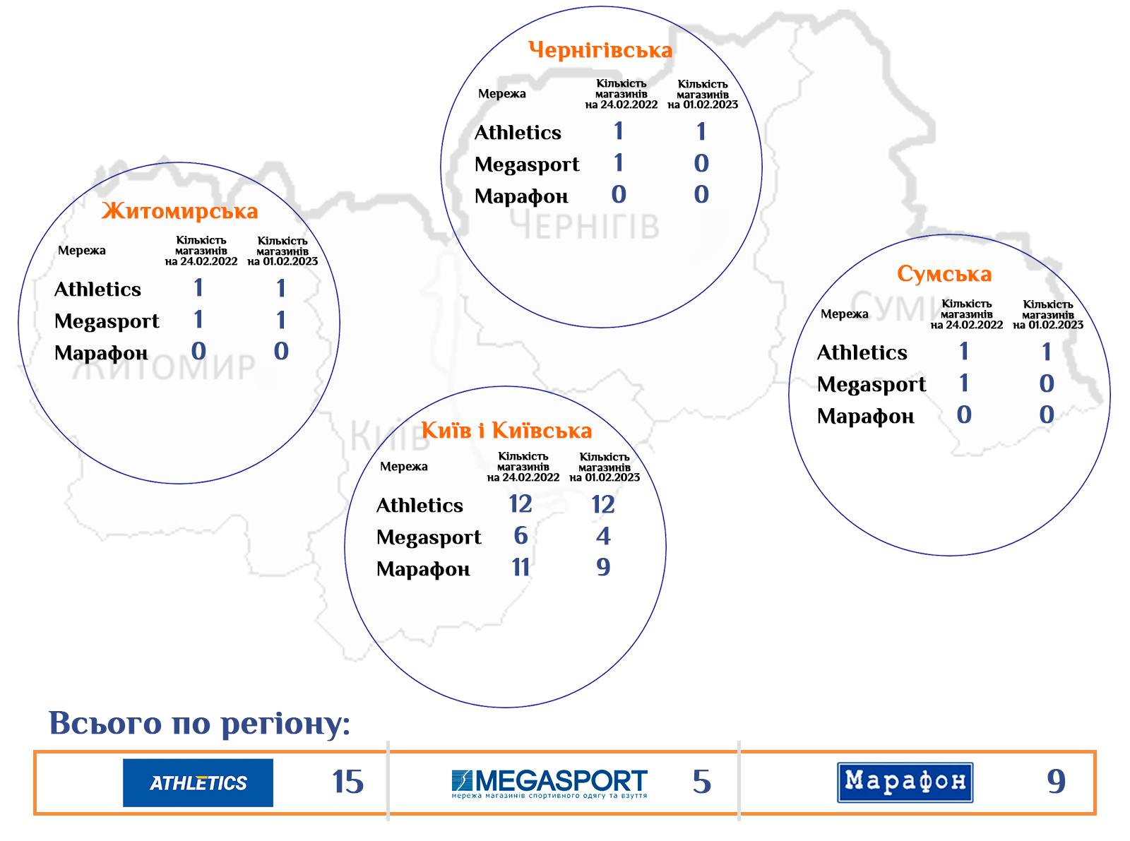 На півночі України спортивні мережі майже повністю відновили свою діяльність, а Athletics навіть відкрила тут нову торгову точку на лівому березі Дніпра у Києві, хоча мережа змушена була закрити свою торгову точку у київському ТРЦ Blockbuster Mall.