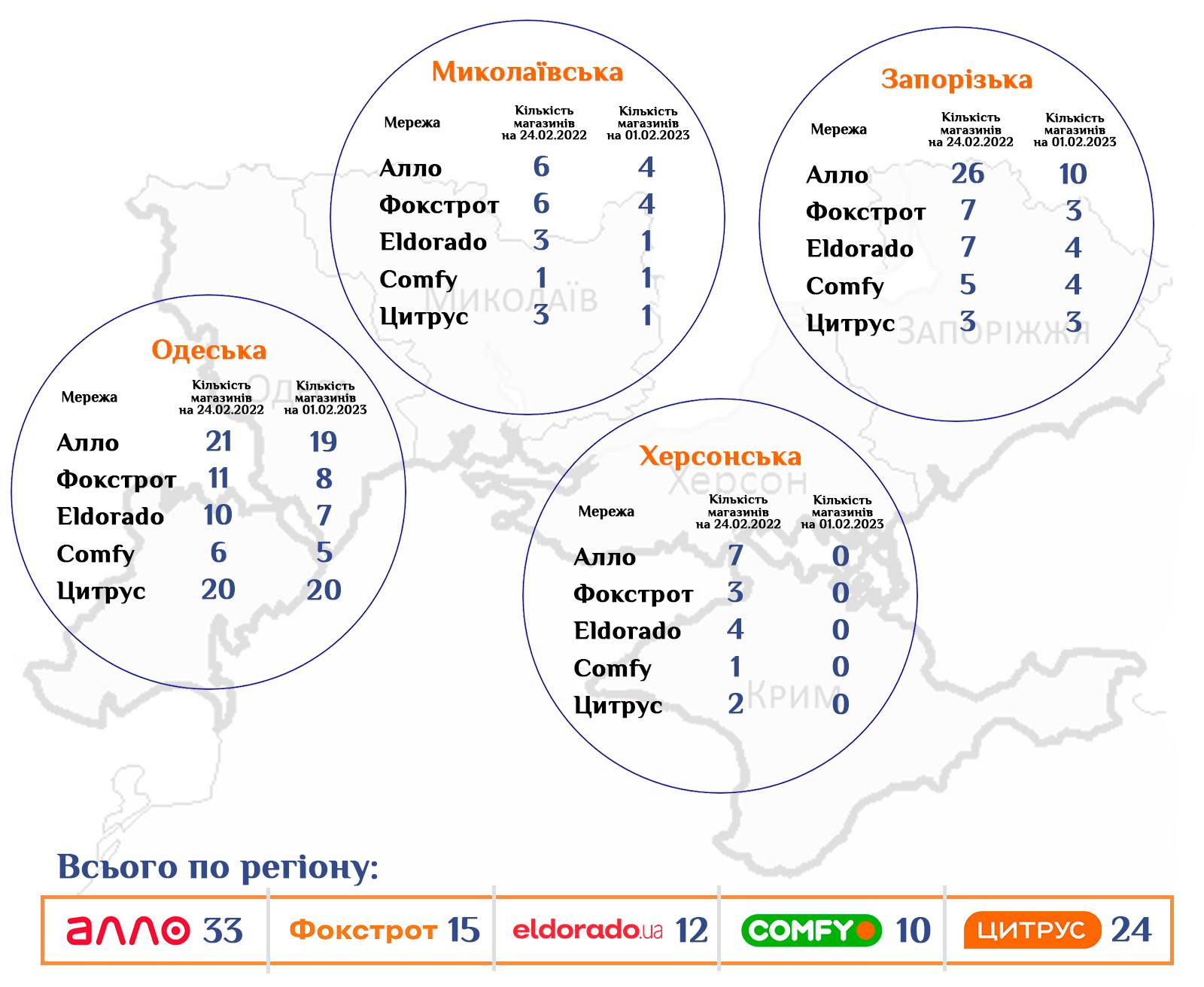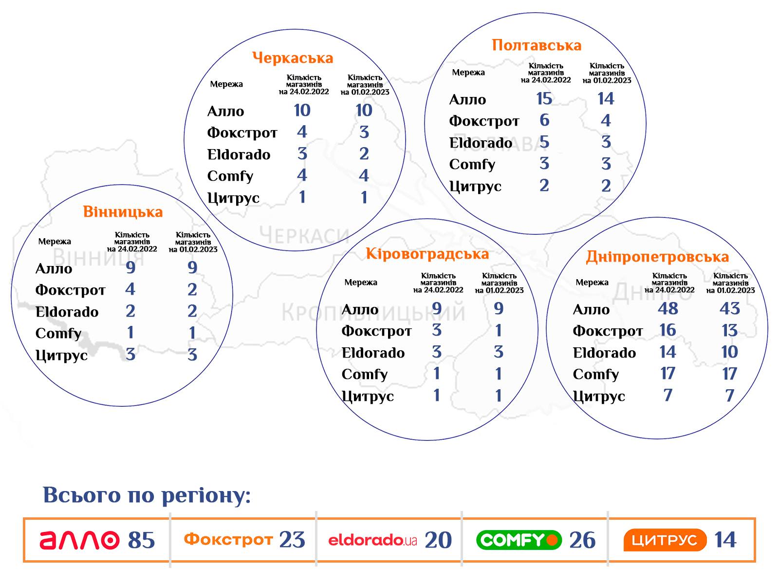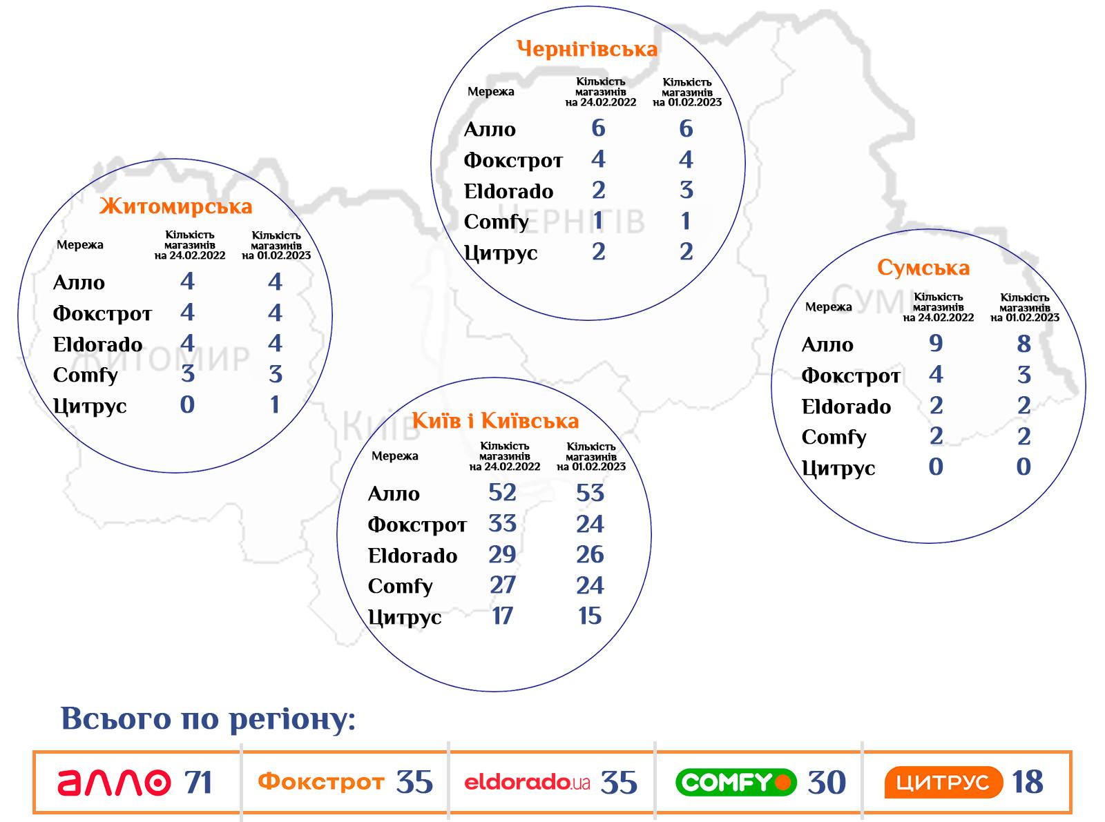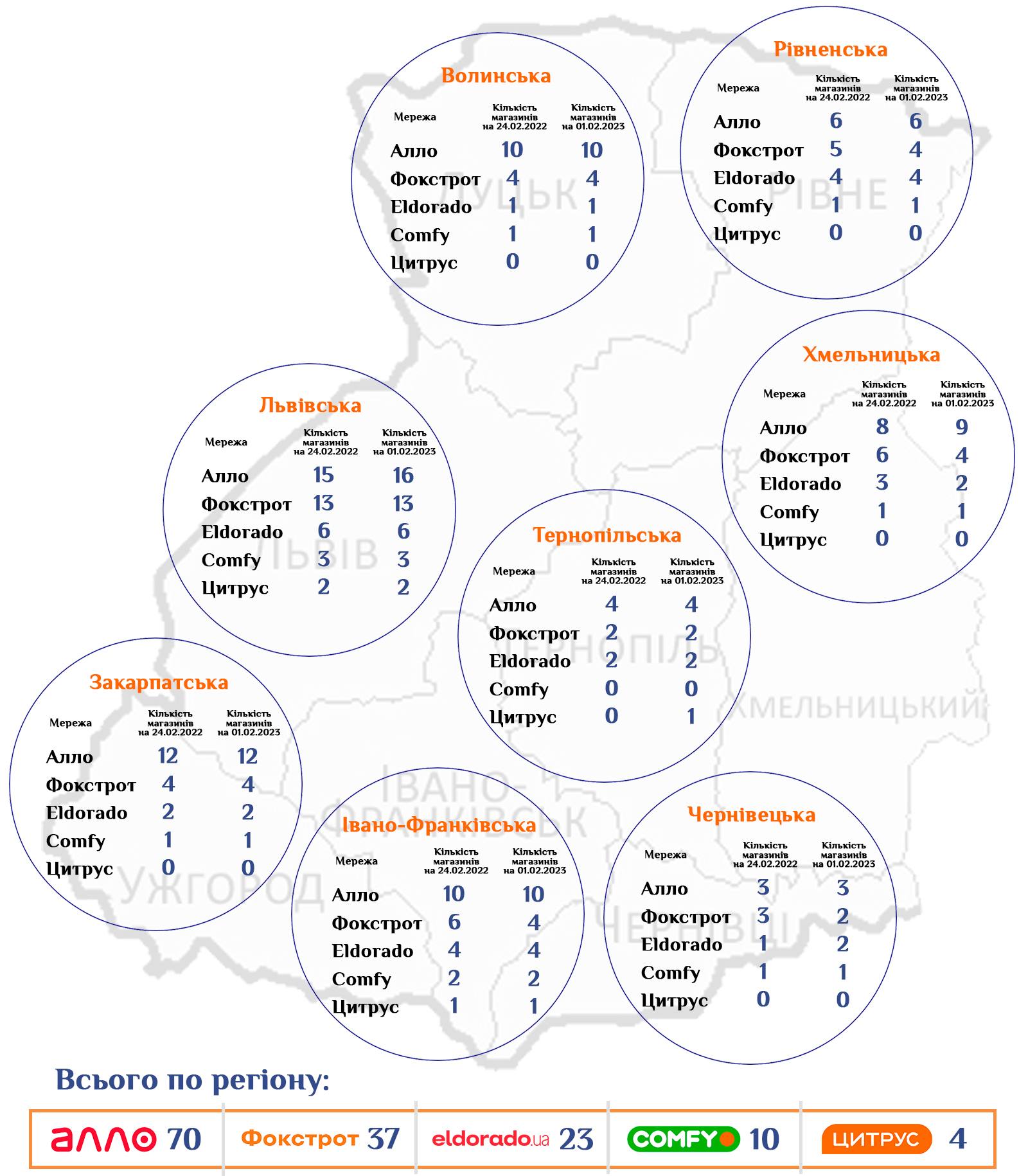 Незмінними мережі основних гравців через рік війни лишаються в Закарпатській, Тернопільській та Волинській областях. На одну локацію Алло розширив мережу у Львівській та Хмельницькій, а Eldorado – у Чернівецькій області.