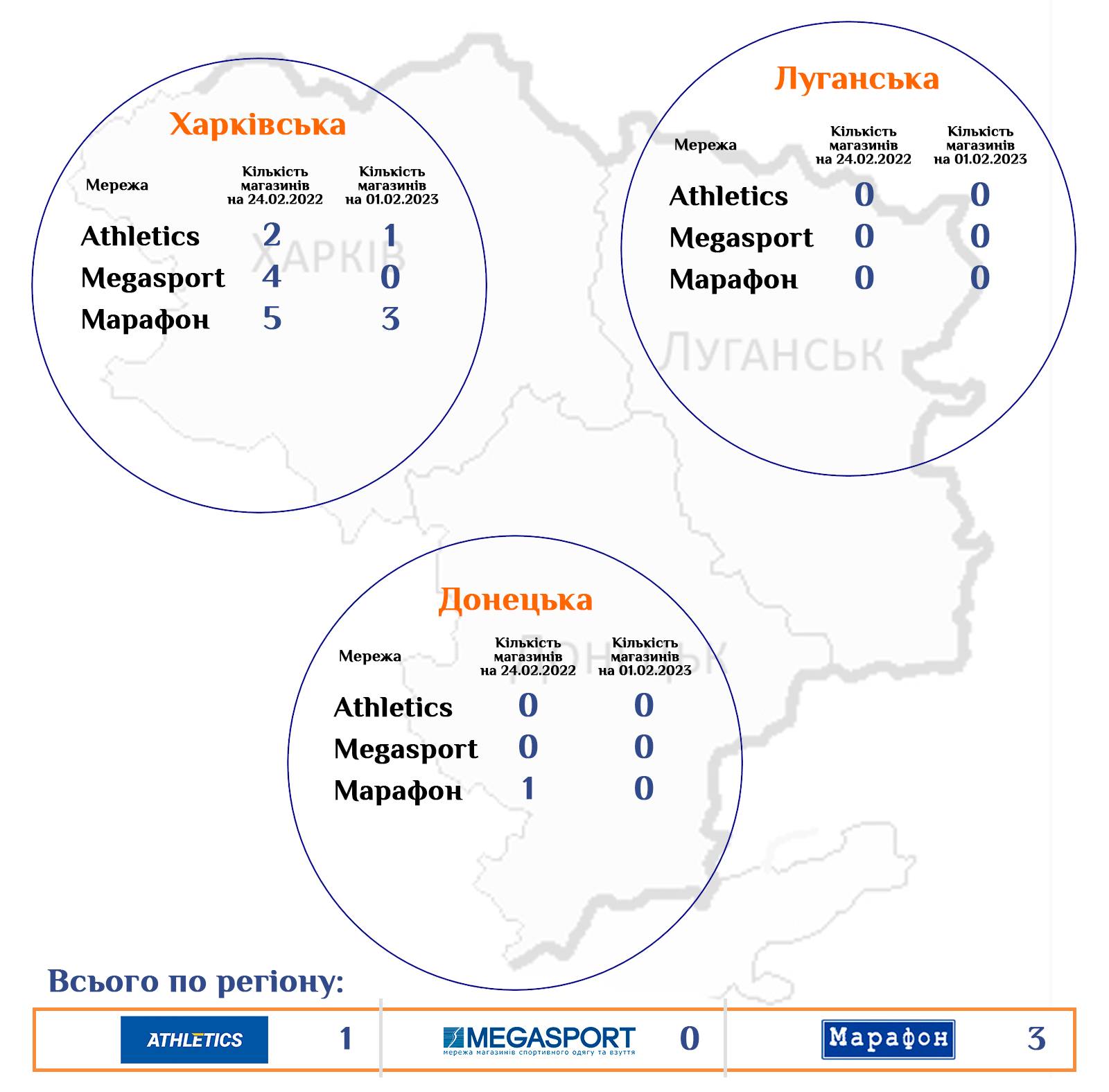Усі спортивні мережі помітно скоротили свою присутність у східному регіоні України, де зараз ідуть запеклі бої з російськими окупантами. Так, мережа Athletics до війни мала два магазини у Харкові. На жаль, один з них був зруйнований ворожою ракетою, але інший продовжує працювати. Мережа Megasport після початку воєнного вторгнення закрила всі чотири магазини у Харкові, які наразі не відновили свою роботу. А мережа Марафон відновила три з п’яти магазинів у Харкові та, на жаль, втратила свою торгову точку у Маріуполі, який зараз окупована ворогом.