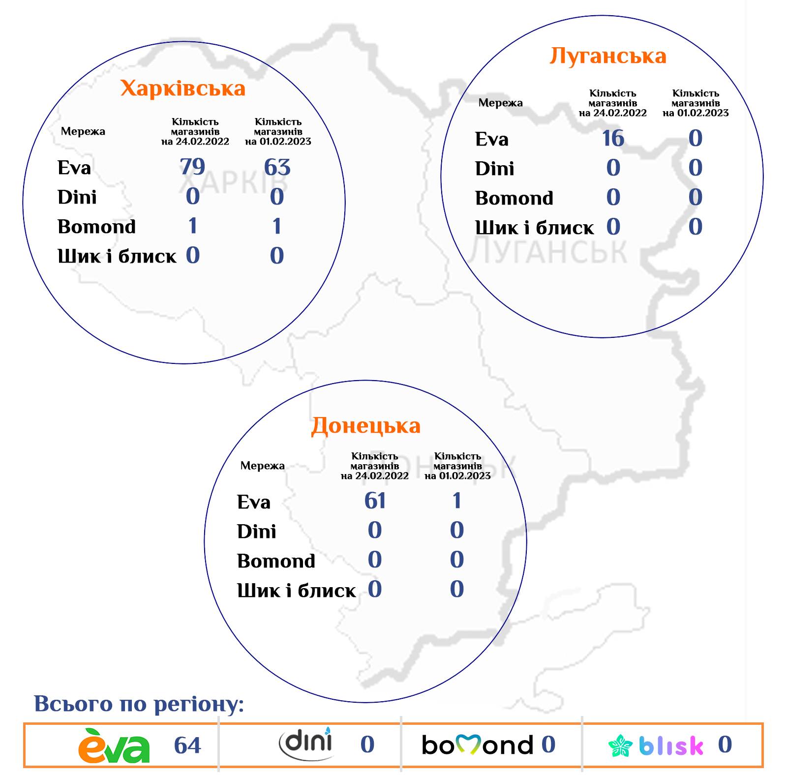 На сході країни, де відбуваються активні бойові дії, війна знищила або унеможливила роботу більшості мереж. Так, у Луганській області, яка свого часу була майже повністю окупована, мережа АТБ втратила 13 торгових точок і ще 57 – у Донецькій області. Так само у цих двох областях недорахувалася 12 супермаркетів мережа Сільпо. Лише М’ясомаркет зберіг свою присутність у Донецькій області, де продовжують працювати три магазини.