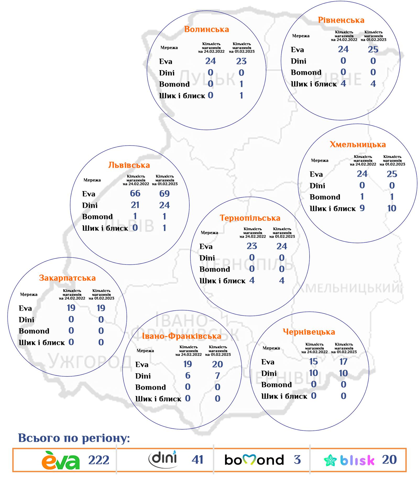 Західний регіон України найбагатший на нові відкриття. Тут минулого року збільшили свою присутність усі опитані рітейлери з галузі drogerie. Зокрема, EVA відкрила у цьому регіоні десять нових торгових точок, Dini – чотири, Bomond – одну, а Шик і Блиск – три.