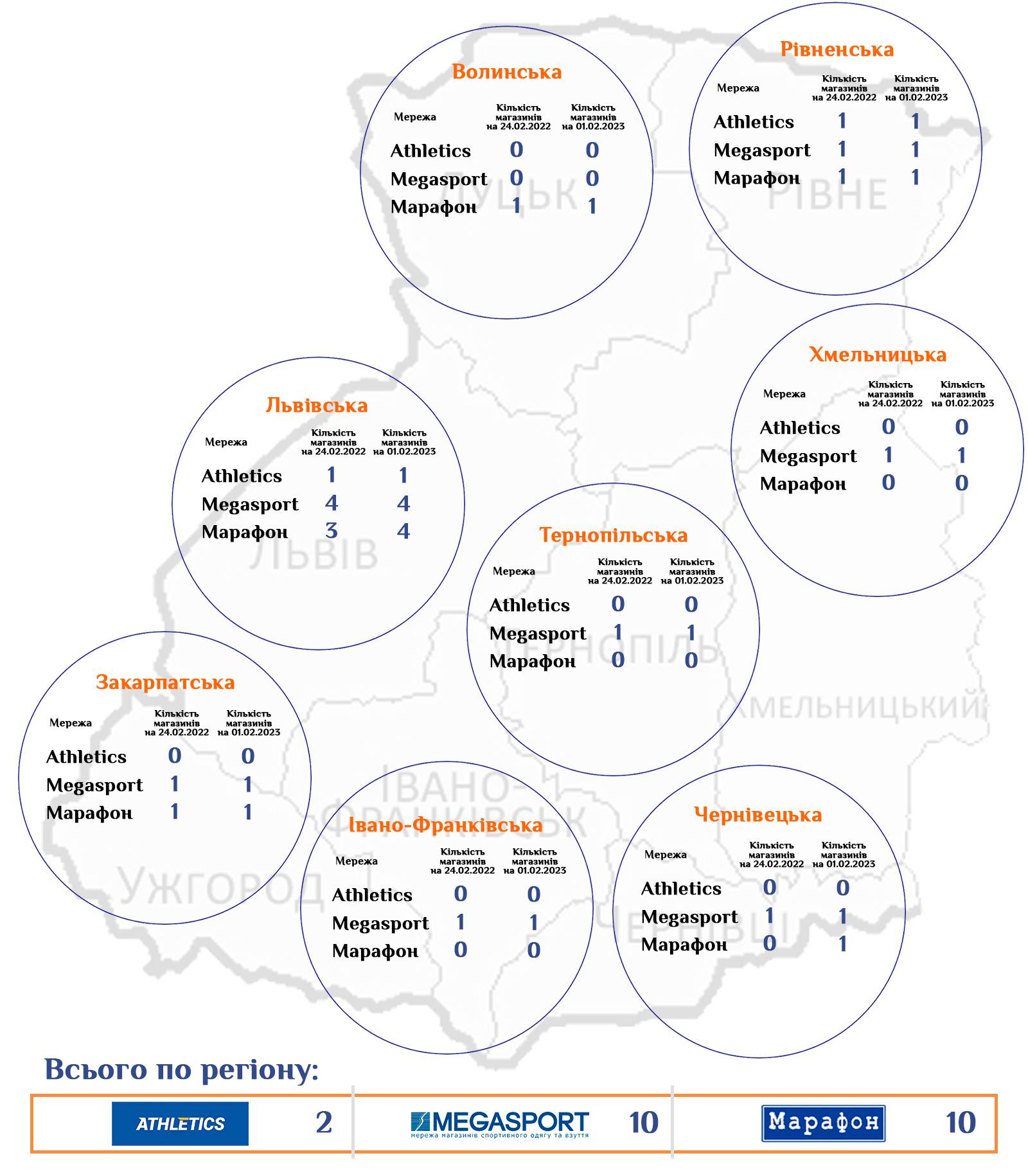 Очікувано, усі спортивні рітейлери стабільно продовжують працювати у західному регіоні. Тут не було жодного закриття. А мережа Марафон навіть відкрила кілька нових магазинів.