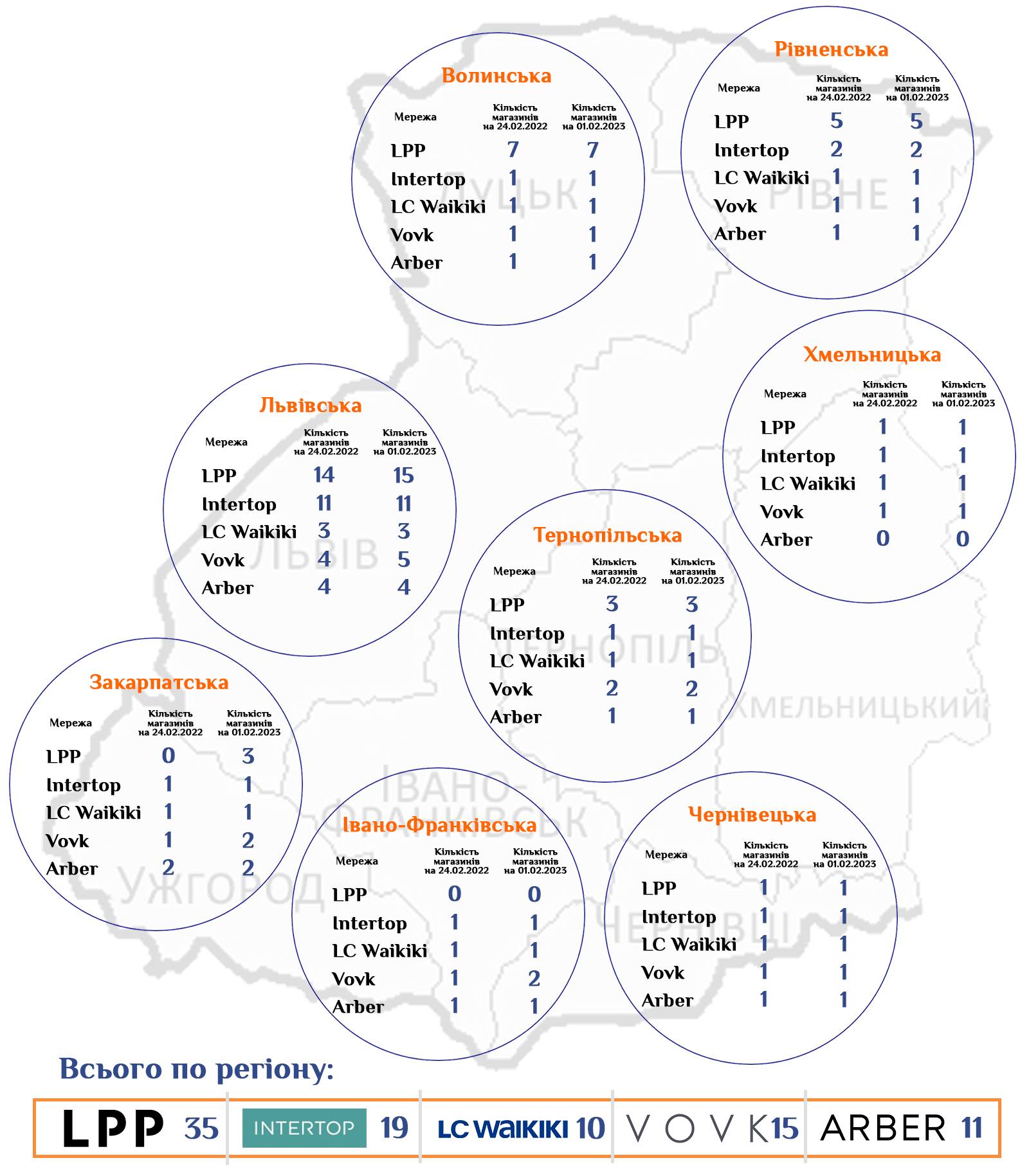 Не дивно, що у західному регіоні України рітейлі загалом та у fashion-рітейлі зокрема спостерігається найсприятливіша ситуація для розвитку та розширення. Так, усі п’ять опитаних fashion-рітейлерів працюють тут на повну потужність, LPP відкрив новий магазин у Львові, мережа VOVK відкрила три нових магазини у Львівській, Івано-Франківській та Закарпатській областях. А LC Waikiki готує нове відкриття у Червонограді Львівської області.