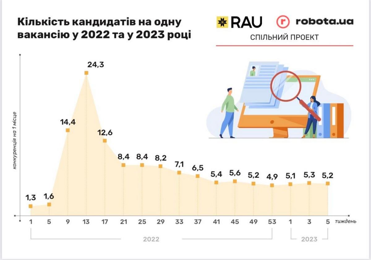 У довоєнний період (з початку і до 23 лютого 2022 року) спостерігалася впевненість гравців ринку у подальшому розвитку. Ринок рухався вперед і кількість вакансій та резюме на них знаходилася у здоровому балансі. Достатньо відмітити, що середня кількість кандидатів на одну вакансію коливалася в межах 1,3-1,6, тобто майже кожен, хто шукав роботу, міг її отримати. Після початку повномасштабного вторгнення кількість вакансій у всіх сферах вітчизняної економіки скоротилася до 7% від довоєнного рівня. Водночас кількість претендентів на одне місце підскочила удесятеро й становила в середньому 14,4. На початку квітня конкуренція серед бажаючих знайти роботу збільшилася до максимального рівня – 24,3 претендентів на одне місце.