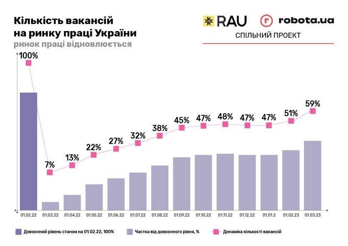 Хоча саме в квітні 2022-го рекрутери зафіксували тренд на відновлення ринку праці в Україні, який продовжується й досі. Так, станом на 1 березня 2023 року вже відновилося 59% ринку вакансій. Відповідно лише наприкінці квітня кількість претендентів знизилася до 12,6 на місце. Відповідно влітку 2022-го на одну вакансію претендувало близько 8 кандидатів, а вже у січні 2023 року – тільки 5,2. Тобто лише втричі більше, ніж у мирний час.
