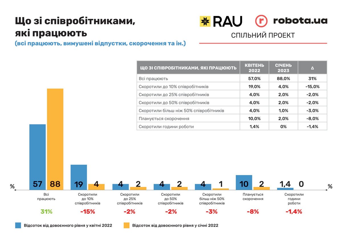 По мірі стабілізації ситуації на фронті та в економіці покращилися й умови роботи персоналу. Так, у січні 2023 року вже 88% рітейлерів задіяли в роботі весь наявний персонал. Це на 31% більше, ніж було у квітні минулого року. Наразі вже немає компаній, які працюють за скороченим графіком. Кількість тих, хто скоротив персонал чи ще планує такі дії, впала до рівня 1-4%.