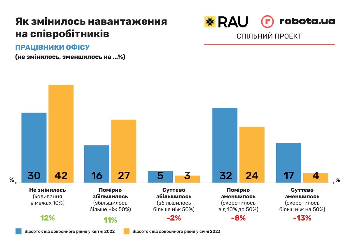 При цьому більше 40% офісних працівників роблять свою справу у довоєнних об’ємах і лише 3% стали працювати значно більше. Проте й тут поменшало тих, хто каже про зменшення навантаження, а 27% відчули помірне збільшення кількості роботи, що більше на 11% ніж у квітні 2022-го.