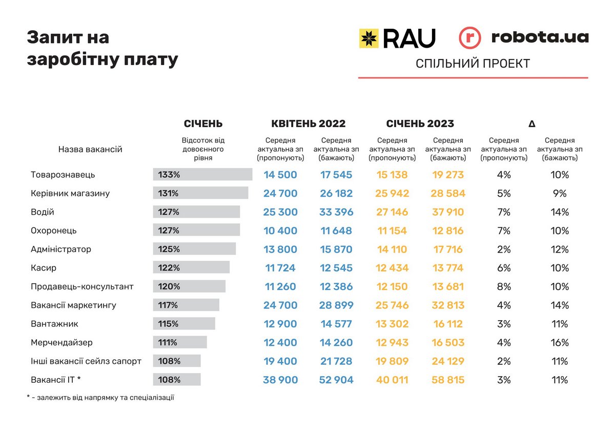 Незважаючи на великий попит, професія водія не є серед перших, кому підіймали платню. У січні 2023 року рітейлери готові були платити на 33% більше довоєнного рівня товарознавцям. На другому місці – керівник магазину (+31%), а водії лише на третьому місці з показником зростання оплати праці у 27%. До першої п’ятірки за темпами зростання зарплати входять також охоронці (+27%) та адміністратори (+25%). Інші категорії робітників можуть розраховувати на підвищення платні на 8-20% в залежності від фаху.
