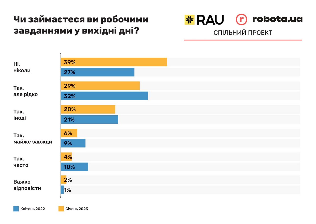 Водночас кількість тих, хто змушений працювати у вихідні, має тенденцію до зменшення. Часто це роблять лише 4% проти 10% у квітні 2022-го. Відповідно кількість працівників, які ніколи не затримуються на роботі вже не 15%, а 16%; не працюють у вихідний 39%, а не 27%, як було у квітні 2022 року.