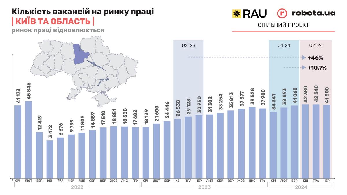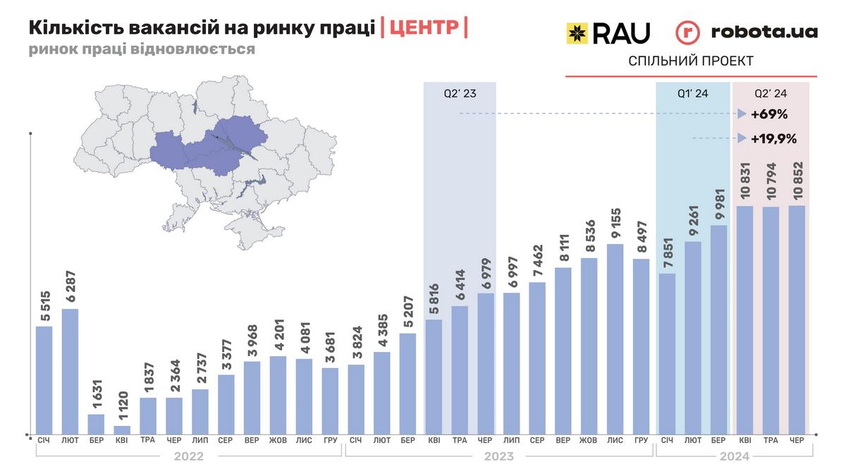 Київ та область історично є найбільшим осередком вакансій – тут їх на середину літа було 41 800, причому відновлення столичного ринку праці почалося ще навесні 2022-го й продовжується до сих пір. За квітень-червень 2024 року вакансій тут побільшало на 10,7% порівняно з перши кварталом та одразу на 46% рік до року.
