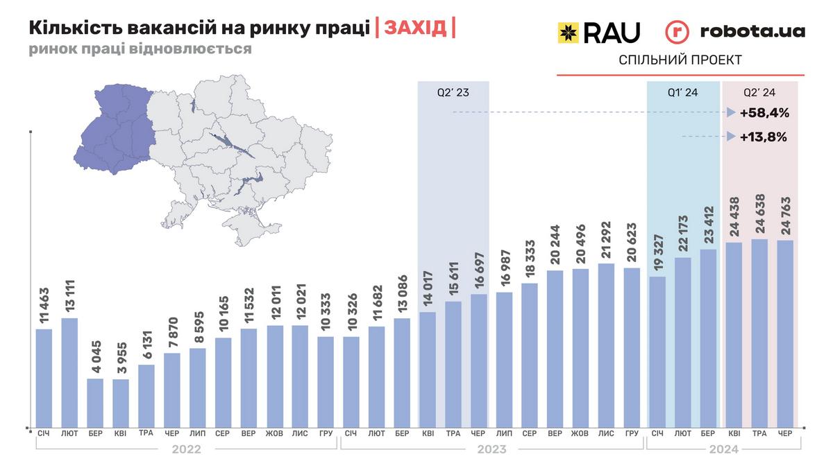 Також динамічно розвивається ринок праці у західних областях країни. Наразі тут зафіксовано 24 763 вакансії, що майже на 14% більше ніж у першому кварталі цього року та на 58% більше за аналогічний показник рік тому. Це в тому числі результат релокації частини бізнесів у більш безпечні регіони.