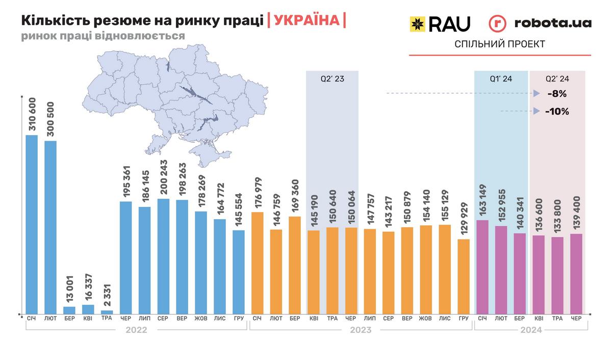 На противагу позитивній динаміці у вакансіях, дещо інша ситуація спостерігається з резюме. Наче дзеркало, вона відображає демографічну ситуацію в країні. Кількість кандидатів загалом на ринку зменшується, тому кадровий голод посилюватиметься. Відповідно перед ринком праці все гостріше поставатимуть виклики утримання співробітників та залучення кандидатів. Кількість тих, хто шукає роботу. суттєво впала у порівнянні з 2023 роком по всіх регіонах і станом на червень склала 139 400 резюме. Це менше на 8% ніж торік і на 10% у порівнянні з першим кварталом цього року. Для порівняння: у лютому 2022-го кількість резюме на ринку сягала 300 500 .