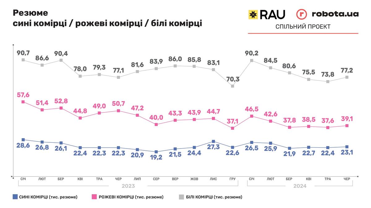 За співвідношенням білих, синіх та рожевих комірців (працівники сфери обслуговування – продавці, офіціанти тощо) зараз переважають білі. Тобто працівники розумової праці, службовці, чиновники, менеджери, інженерно-технічний персонал. Кількість їх резюме за останні півтора року не опускалася нижче 70 000.