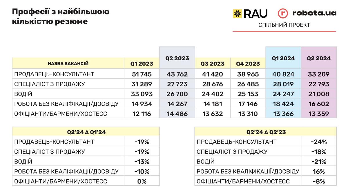 За кількістю резюме безумовним лідером вже кілька років поспіль залишається професія продавця-консультанта. Хоча в цьому році навіть тут наявне скорочення на 24% до минулорічних показників. Також у топ-5 професій стабільно тримаються водії (-21%). Єдина позиція, де спостерігалося збільшення кількості резюме порівняно із 2023 роком, це “робота без досвіду” (+16%). Зазвичай це ті, хто починає свій трудовий шлях. Разом із ними працівники сфери послуг (офіціанти, бармени, хостес) потіснили юристів, економістів, бухгалтерів та шеф-кухарів.