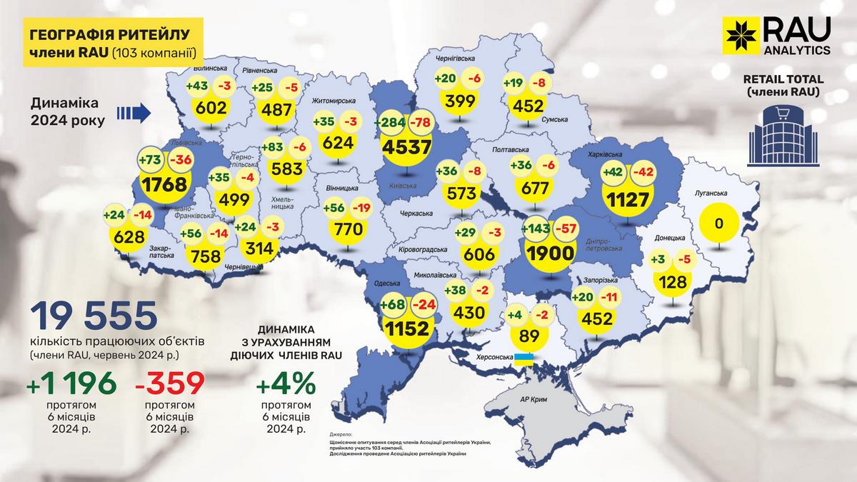 Як показало нещодавне аналітичне дослідження RAU “Географія ритейлу”, 103 провідних ритейлери України за перші шість місяців поточного року відкрили майже 1200 нових торгових точок. Найбільше їх було в столичному регіоні (284), на Дніпропетровщині (143) та Хмельниччині (83). Тобто помітне переміщення активності ритейлу до більш західних областей. Загалом більше сотні членів RAU за півроку наростили кількість магазинів на 4%.