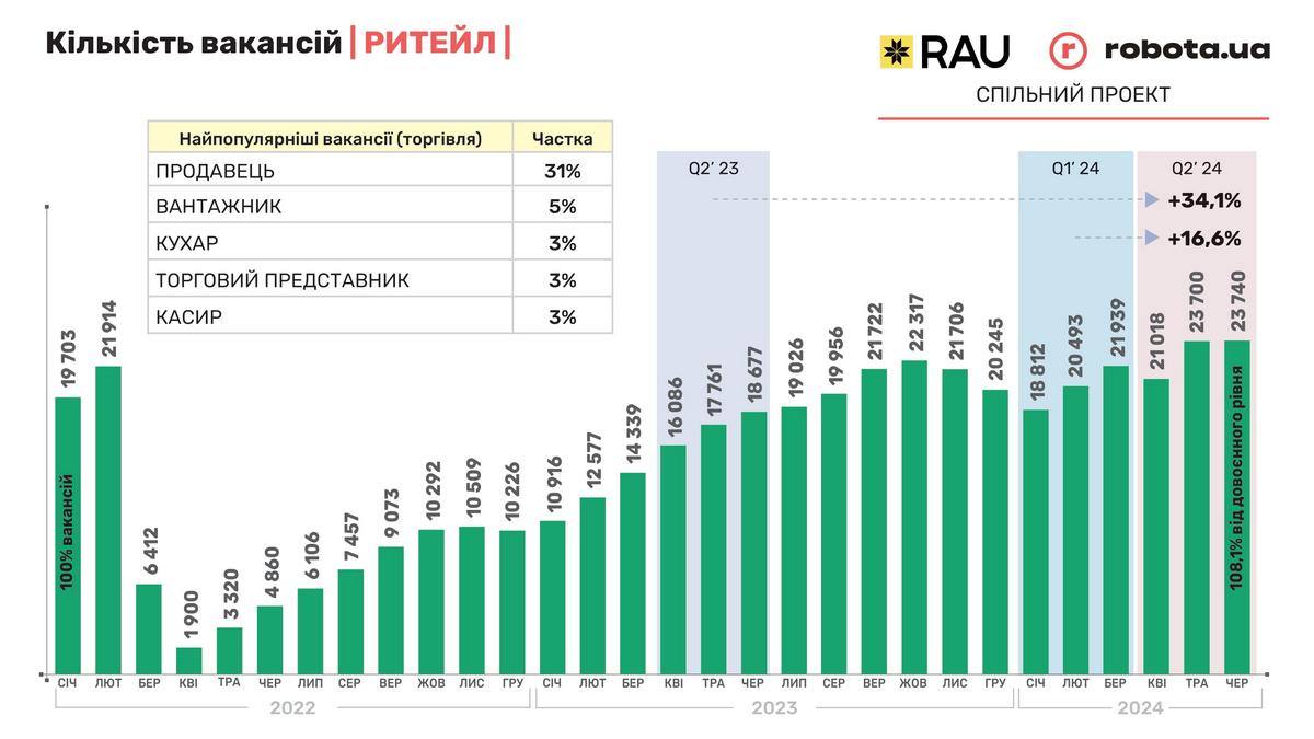 Відповідно до розвитку ритейлу зростає і кількість вакансій у галузі, яка в червні цього року досягла позначки 23 740, що на 8,1% перевищило довоєнний рівень. Порівняно із минулорічним періодом кількість вакансій збільшилася на 34,1%, а за другий квартал цього року – на 16,6%. Майже третина цих вільних місць чекає на продавців.