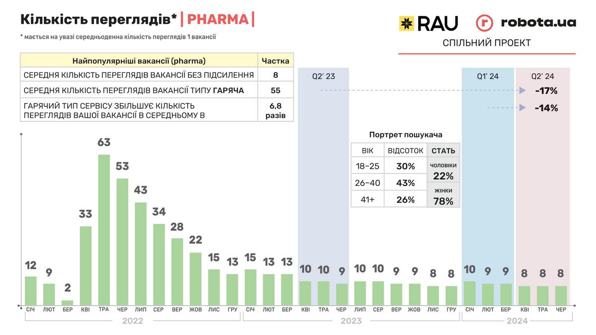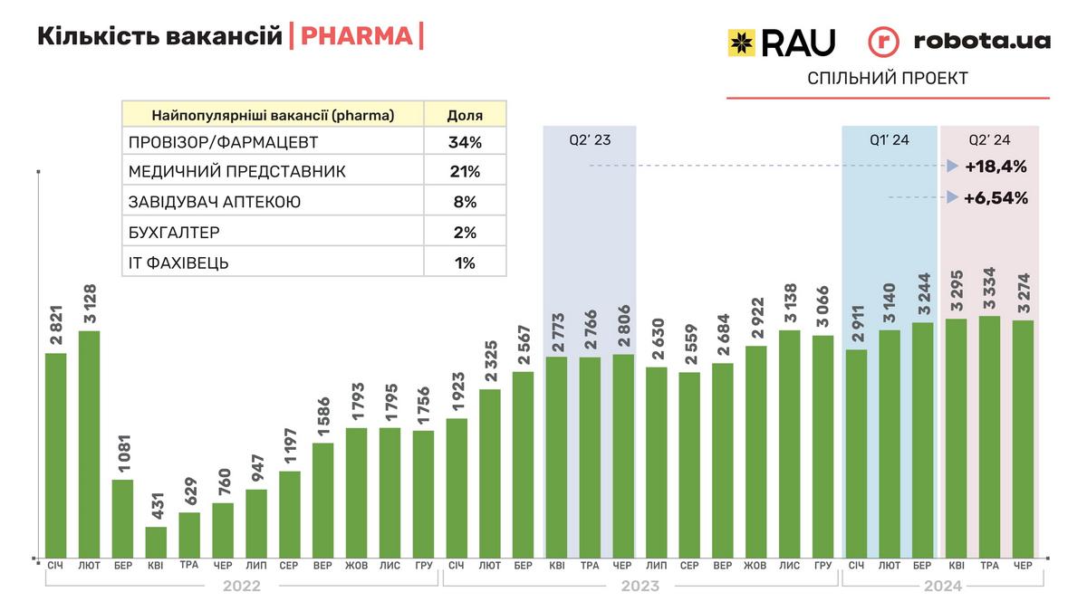 Якщо розглянути детальніше фармацевтичну галузь загалом, де 70% учасників дослідження є представниками ритейлу, а 30% – виробники, не важко помітити схожу динаміку. Так, кількість вакансій постійно збільшується і станом на червень 2024-го перевищувала минулорічний показник на 18,4%, додавши за квітень-червень 6,5%. Серед найбільш популярних посад найбільша частка припадає на провізорів-фармацевтів (34%), які разом із медичними представниками складають половину ринку.