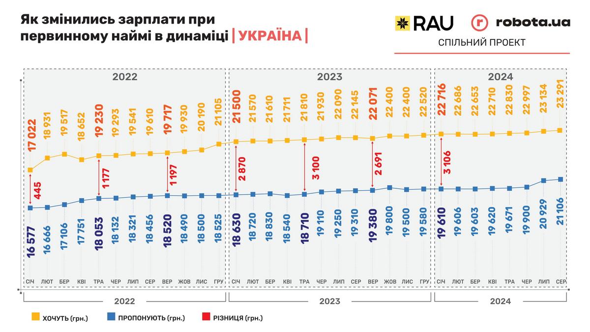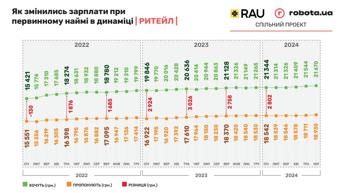В ритейлі ситуація виглядає більш оптимістично, оскільки з другої половини 2023 року різниця між бажаними і пропонованими зарплатами зменшується: роботодавці поступово підвищують оплату праці аби втримати та залучити потрібних фахівців. В той час як шукачі роботи не дуже задирають планку своїх бажань.
