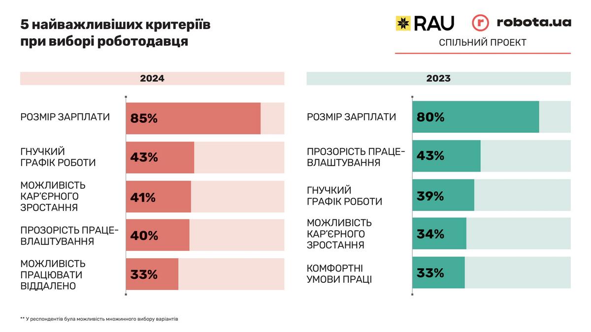 Серед п’яти найважливіших критеріїв при виборі роботодавця на першому місці лишається розмір заробітної плати. Цьогоріч даний фактор став ще більш вагомим – для 85% опитаних.