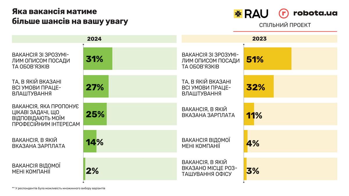 Як і раніше, більше шансів на увагу потенціального співробітника мають вакансії зі зрозумілим описом посади та обов’язків. А також всі умови працевлаштування. І знову серед нових критеріїв вибору в топі з’явився пункт про виконання цікавих задач (25%).