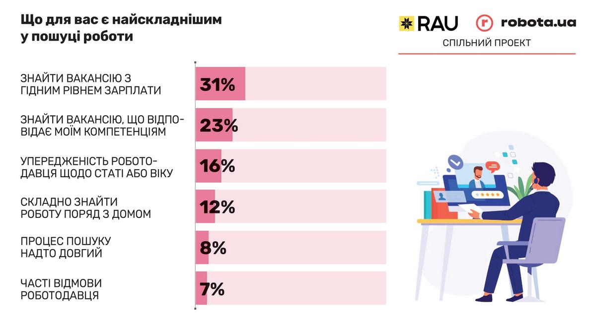 Але знайти вакансію з гідним рівнем оплати праці та відповідну кваліфікації пошукача є найбільш складним завданням. Досить дивно виглядає на фоні посилення дефіциту кадрів упередженість роботодавців щодо статі або віку кандидатів. Хоча цей фактор вказали тільки 16% опитаних.