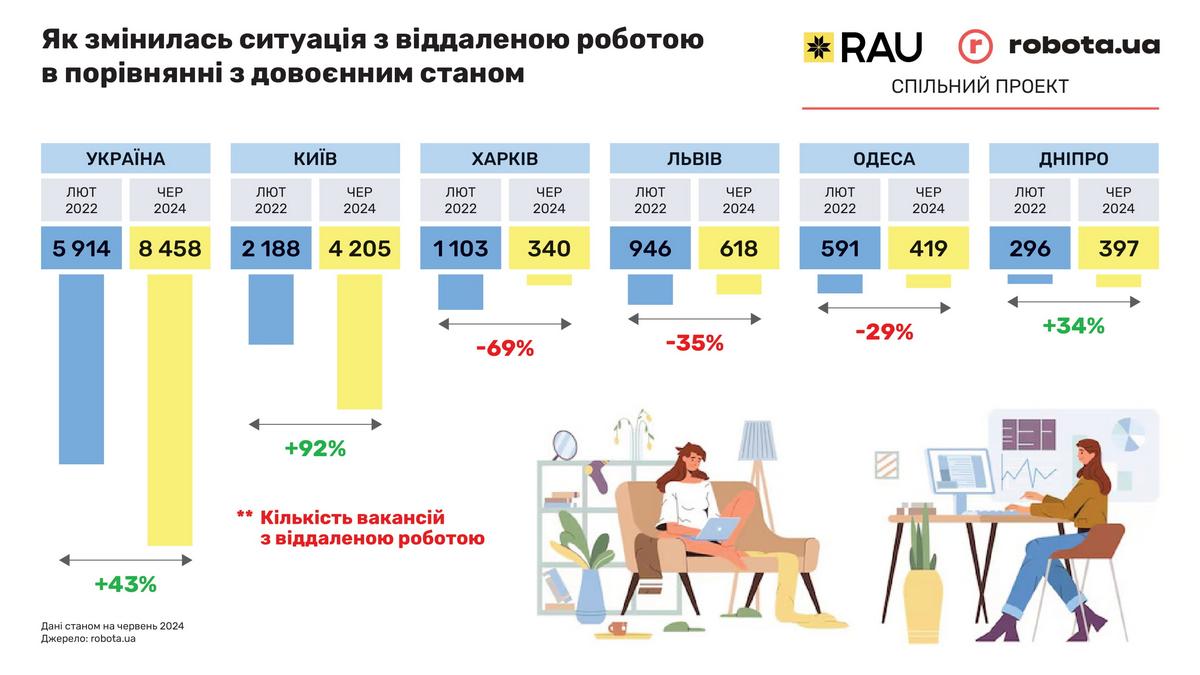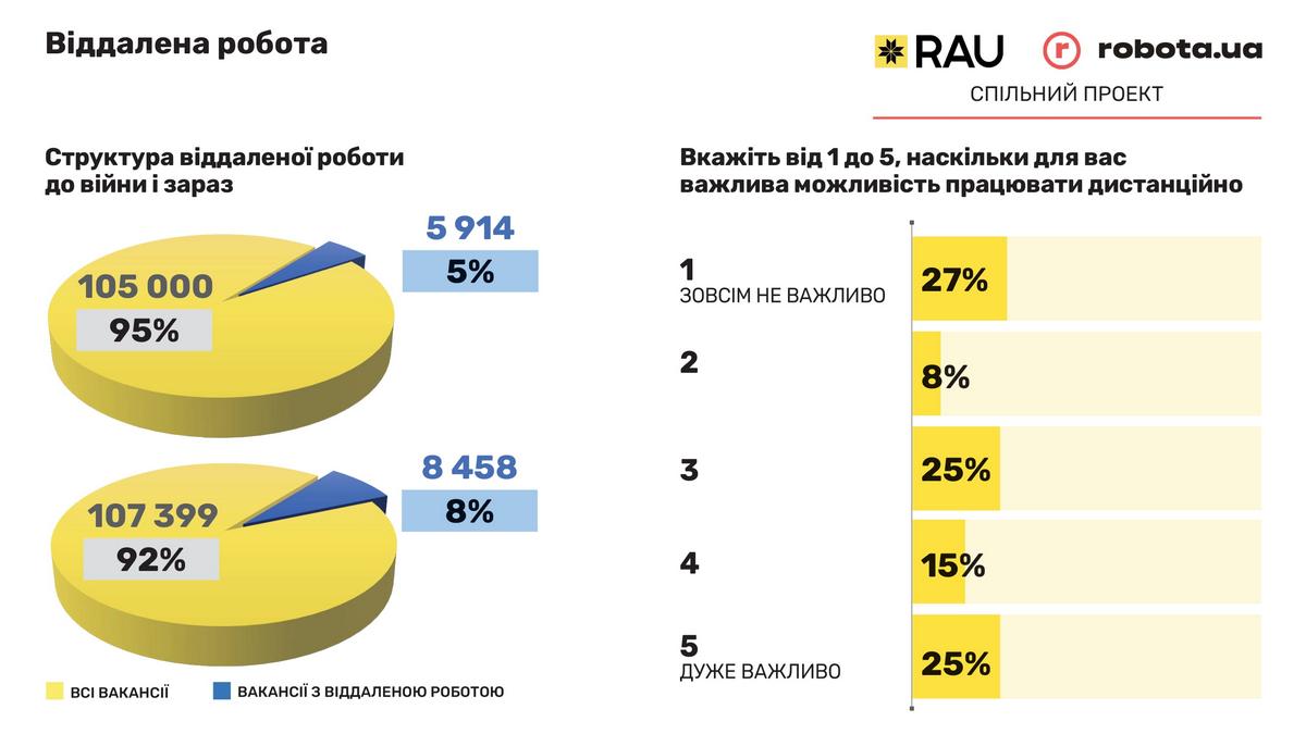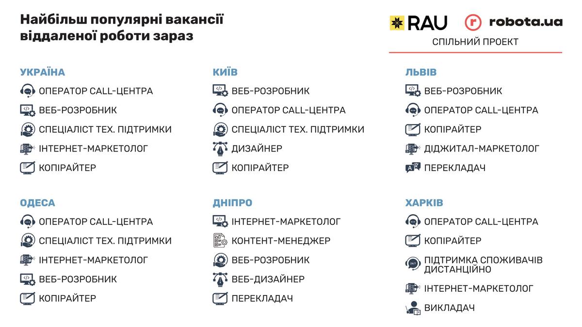 Серед топ-5 основних вакансій, які пропонуються з можливістю віддаленої роботи, переважають спеціалісти технічної підтримки, веб-дизайнери, копірайтери тощо.