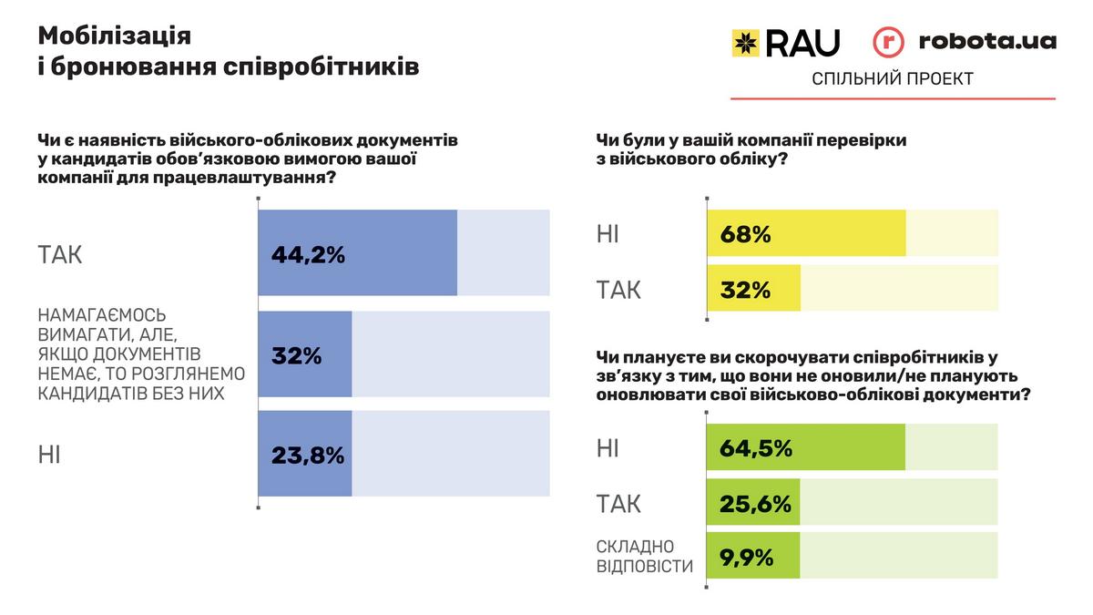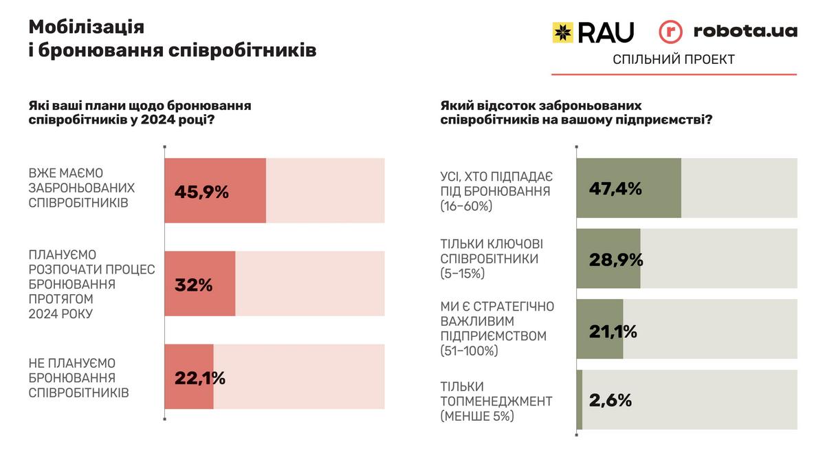 Як показало дослідження, майже 46% компаній вже мають заброньованих співробітників, а ще третина готуються розпочати цей процес. Цікаво що майже половина компаній вже забронювали всіх можливих співробітників, а майже 28% – тільки ключових фахівців.