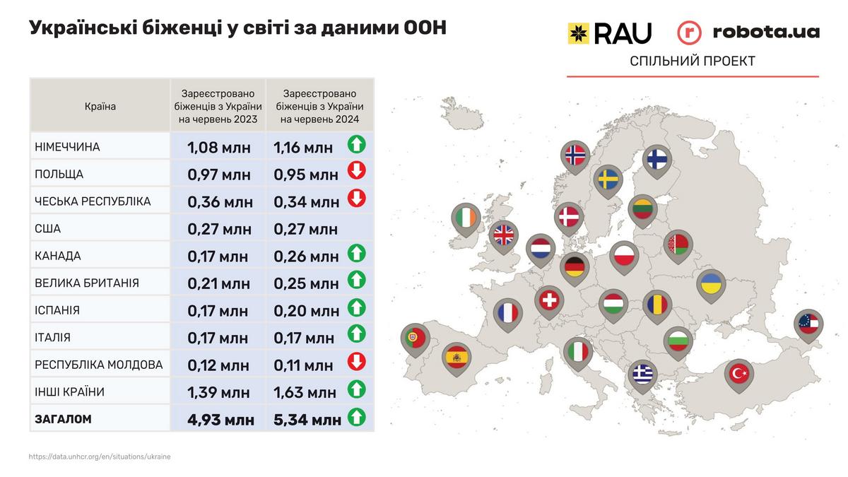 Загалом з України під час війни, за даними ООН, станом на червень 2024 року виїхало більше 5 млн осіб. Останнім часом кількість біженців у Польші, Чехії та Молдові почала скорочуватися, але в інших країнах помітно приріст. Як от в Канаді, Німеччині, Великій Британії тощо.