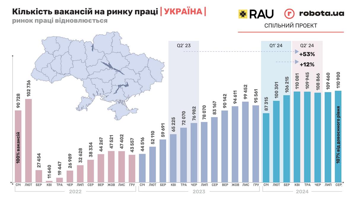Київ та область історично є найбільшим осередком вакансій – тут їх на середину літа було 41 800, причому відновлення столичного ринку праці почалося ще навесні 2022-го й продовжується до сих пір. За квітень-червень 2024 року вакансій тут побільшало на 10,7% порівняно з перши кварталом та одразу на 46% рік до року.