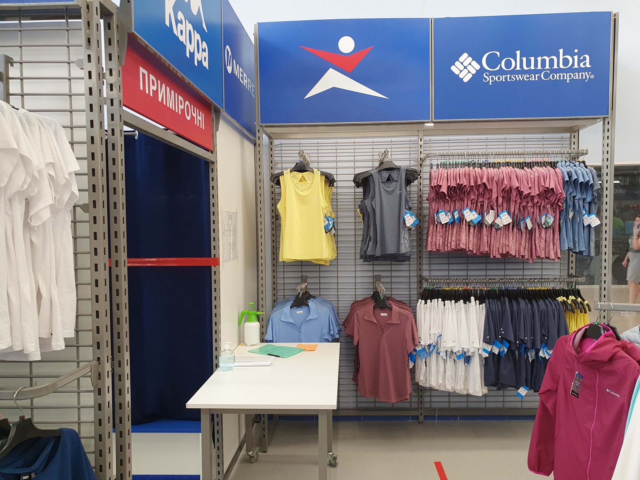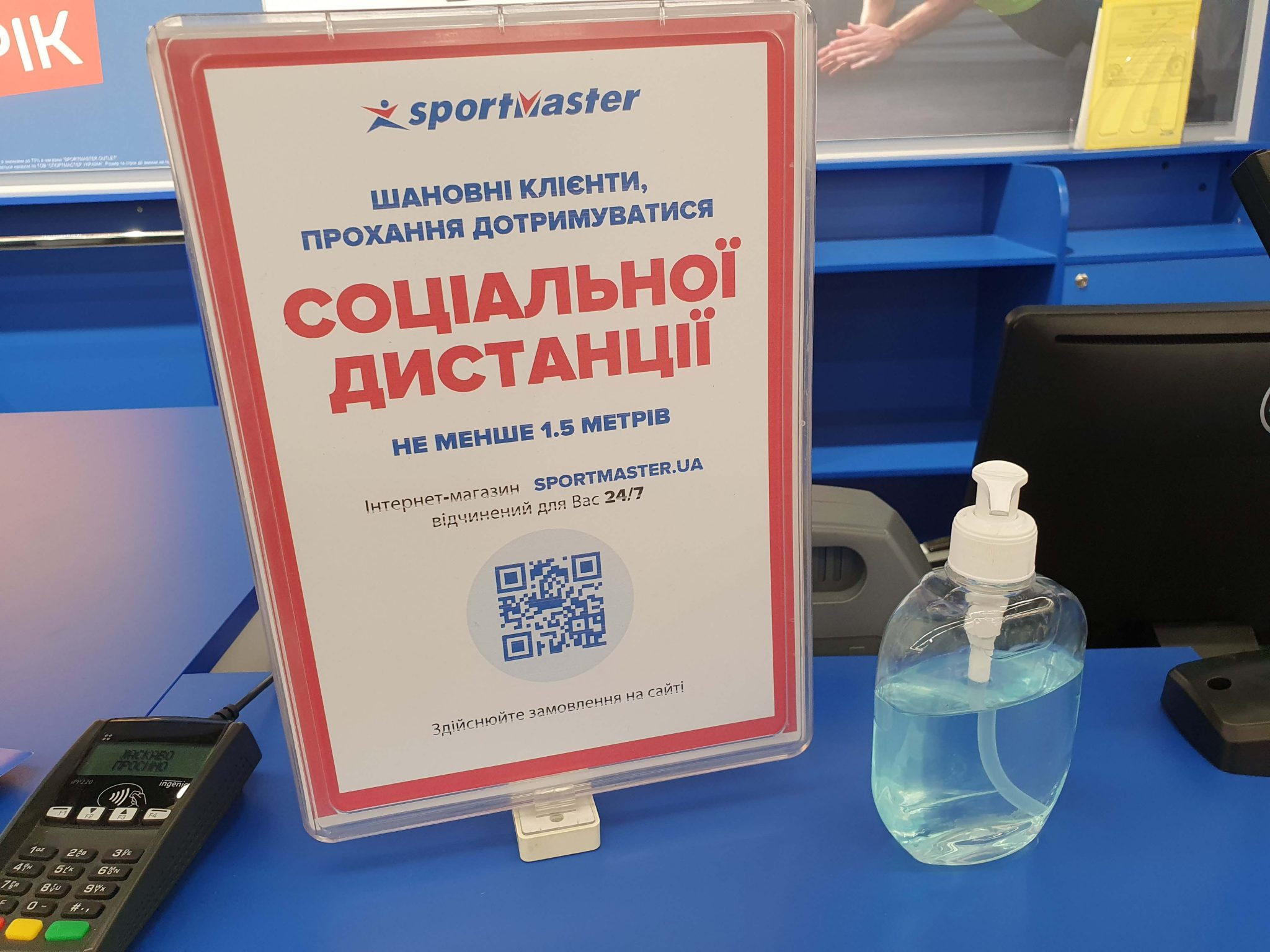 Примірочні в Sportmaster в ТРЦ Dream Town огороджені і працюють через одну. Біля кожної каси і на стійках по магазину є санітайзери з дезінфікуючою речовиною, а також спеціальний засіб, яким кожні дві години обробляються примірочні блоки.