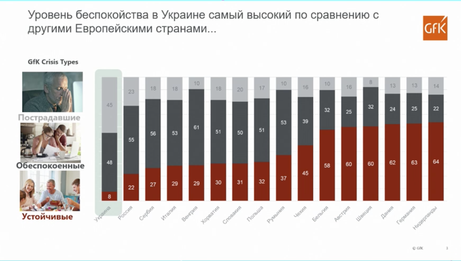 Однак за рівнем занепокоєння українці виявилися на першому місці в Європі. Згідно з міжнародною методологією, все населення ділиться на три групи: постраждалі, стурбовані і стійкі. У ці групи людей відносять за двома критеріями: зміна доходу, а також втрата роботи.