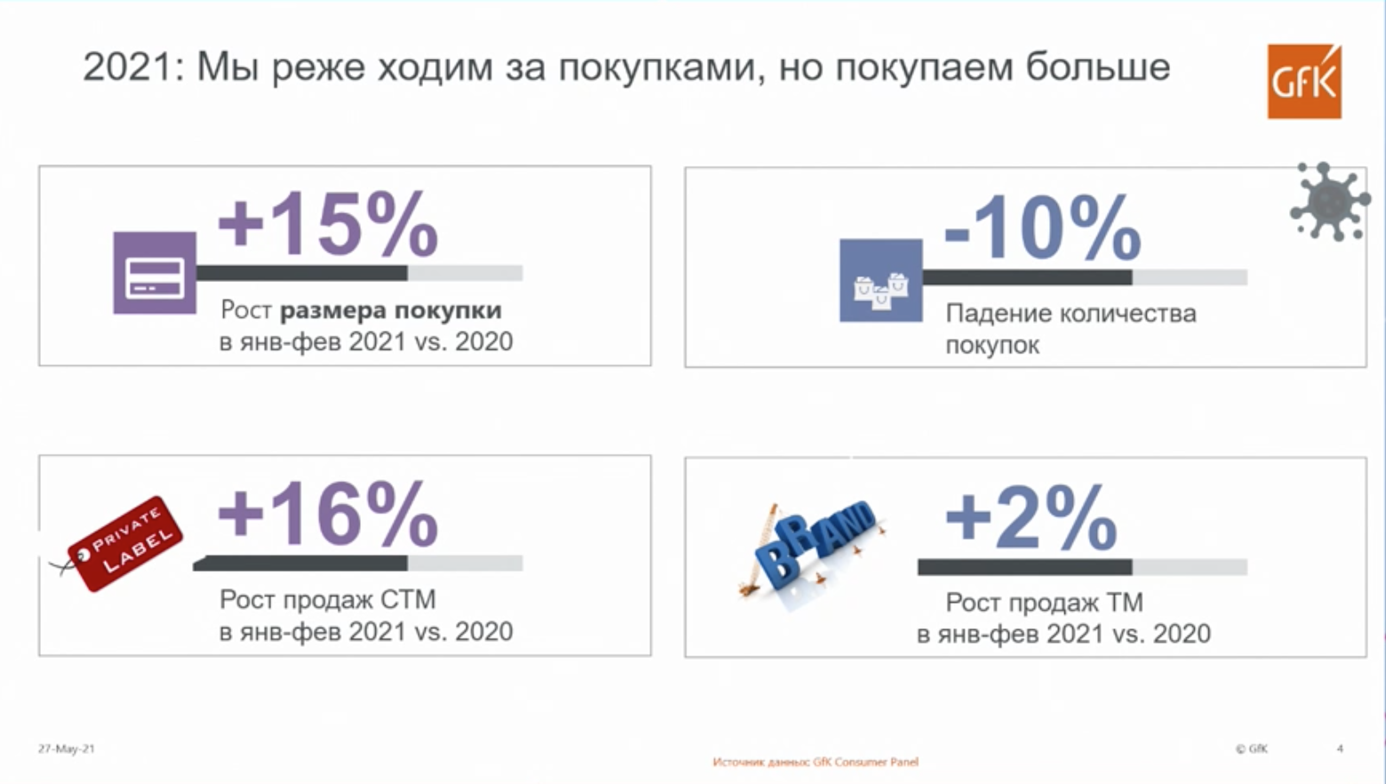 Також звертає на себе увагу сплеск попиту на товари власних торгових марок мереж. Перший сплеск ВТМ трапився якраз в період паніки. Тоді багато брендів не справлялися зі зростаючим попитом, полиці були порожні, і багато покупців вперше поклали в свою корзину СТМ. Пізніше був різкий сплеск продажів брендів. А в кінці року, коли знову стало погано і карантин повернувся, СТМ знову опинилися в кошику. Але споживач уже знав, що бере і що цей товар не поганий. В результаті перші два місяці цього року в порівнянні з періодом до пандемії показали зростання продажів брендів в грошах всього на 2%.
