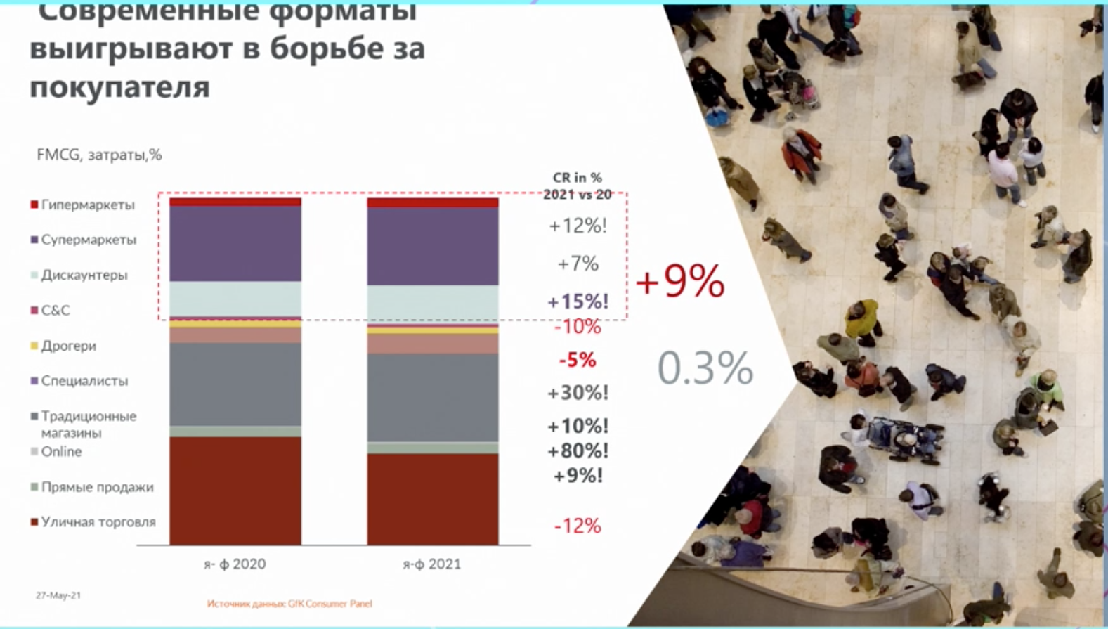 Однак у 2021 році ситуація повністю змінилася. Спеціалізовані магазини продовжують рости, але в цьому році в топ-5 мереж потрапили дуже багато великих форматів, які перебудувалися, запропонували щось додаткове покупцям і добре використовували бажання «купити все в одному місці». Тому гіпермаркети і дискаунтери відчувають себе набагато краще, ніж супермаркети.