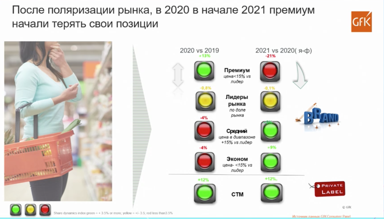 На жаль, в 2021 році економічна ситуація погіршилася (в тому числі зросли ціни) і не всі бренди змогли виправдати надії покупців. Преміум різко здав свої позиції, бо покупці повернулися швидше до золотої середини. Це зовсім не означає, що стали купувати все тільки найдешевше.