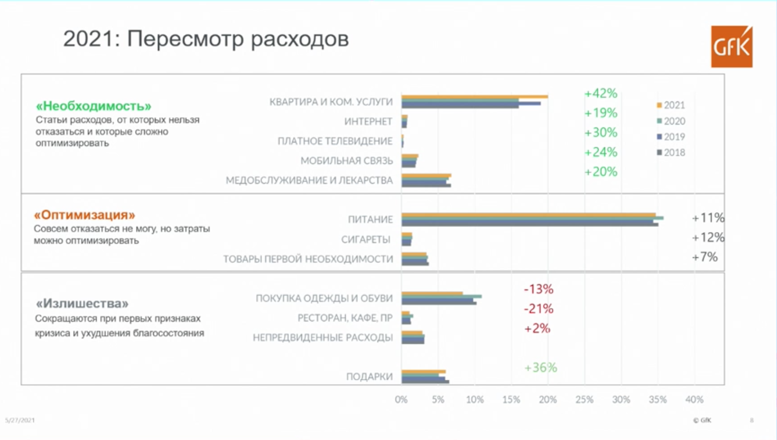 На початку пандемії, в період паніки багато покупців зрадили своїм маркам з різних причин. Перша половина 2020 року характеризувалася великою волатильністю, покупці часто переключалися з марки на марку. В кінці року, навпаки, більшість визначилися зі своїм вибором і ринок практично заспокоївся. У 2021 року споживачі знову спробували раціоналізувати свої покупки, і в результаті популярністю тепер користуються ВТМ, економ і товари середньої цінової категорії.