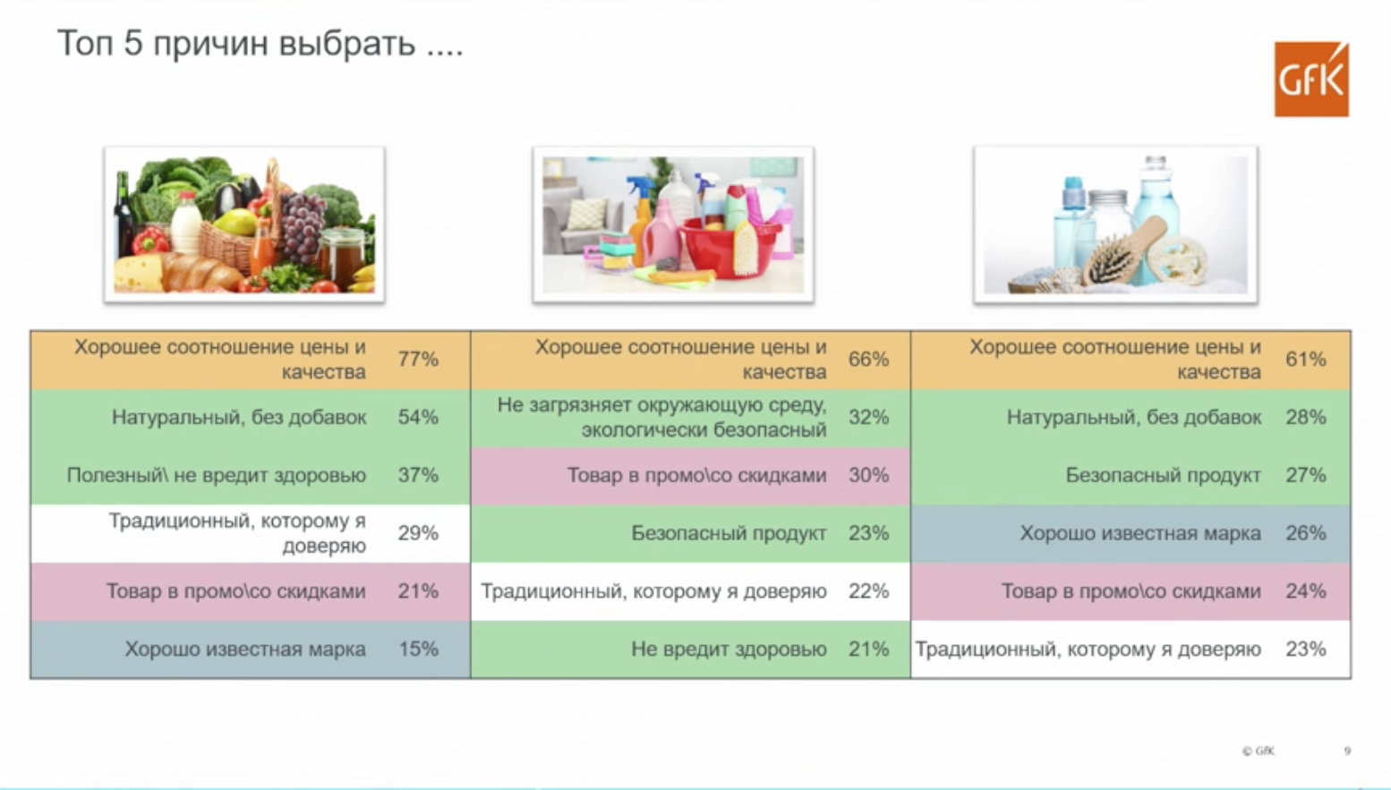 На першій позиції – гарне співвідношення ціни і якості. При цьому ціна може бути далеко не найнижчою. Далі йдуть всілякі варіації корисності (виділені зеленим кольором), натуральності та безпеки. Для різних категорій товарів це формулюється по-різному, але все одно ці вимоги виявляються в топі.